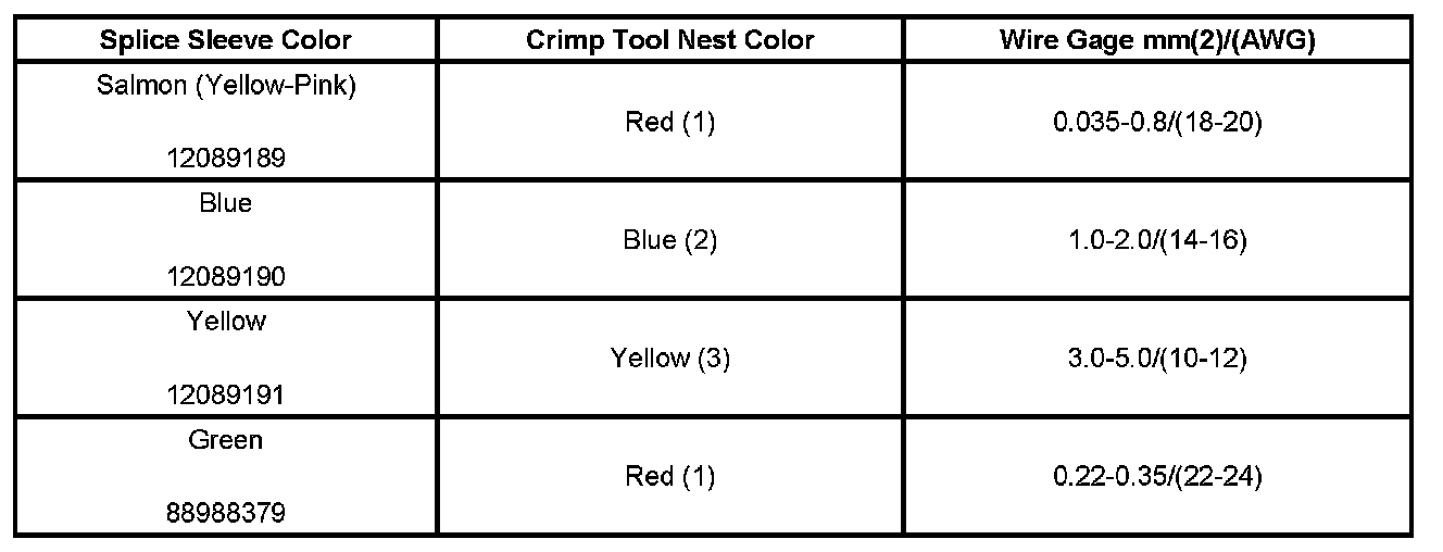 4. Select the proper DuraSeal splice sleeve according to the wire size. Refer to the above table at the beginning of the repair procedure for the color coding of the DuraSeal splice sleeves and the crimp tool nests.
