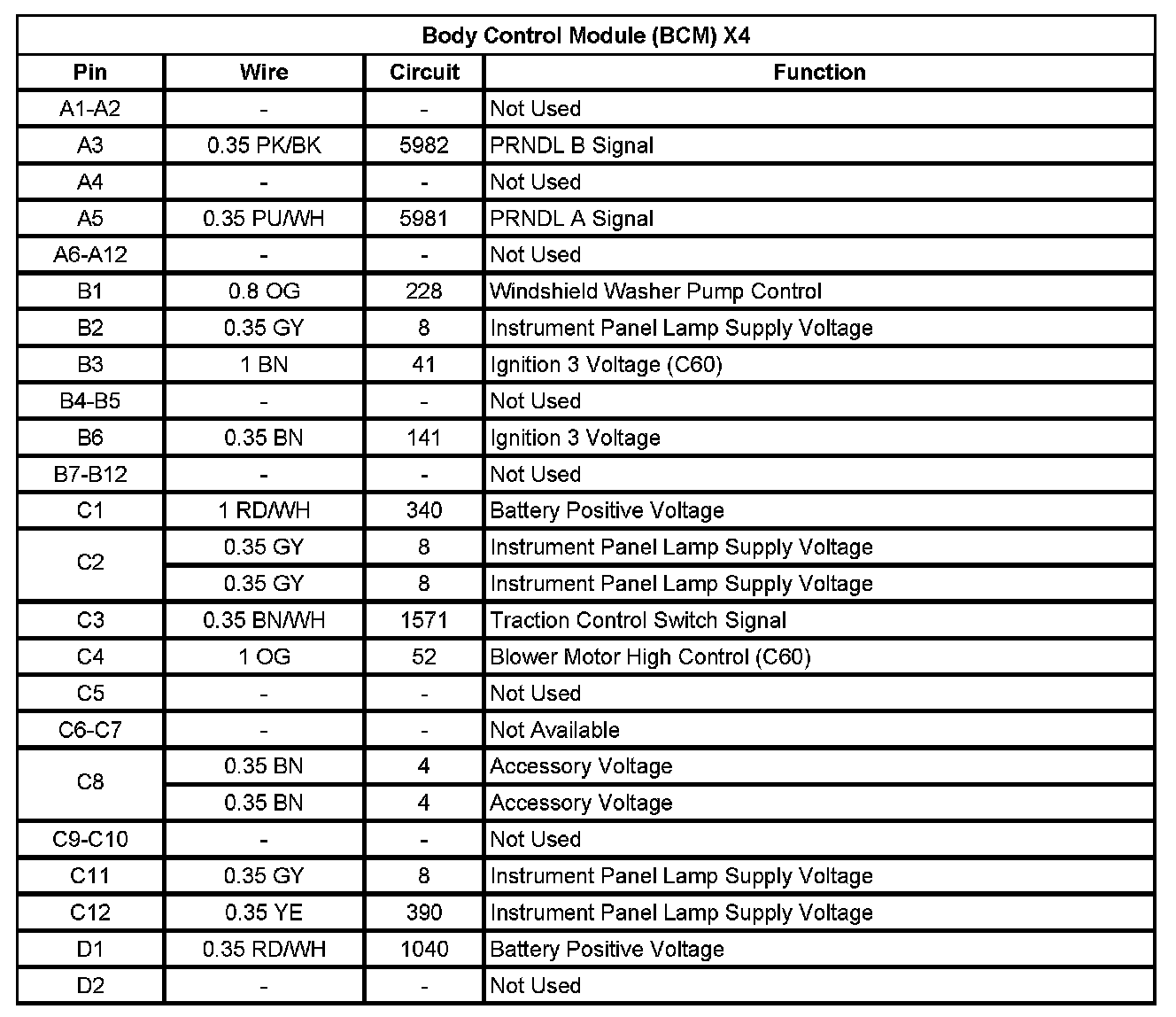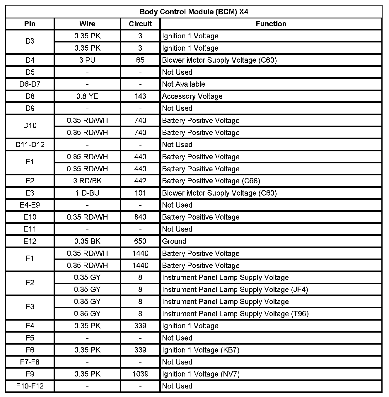 Body Control Module (BCM) X3 (Pin C1 To D12):