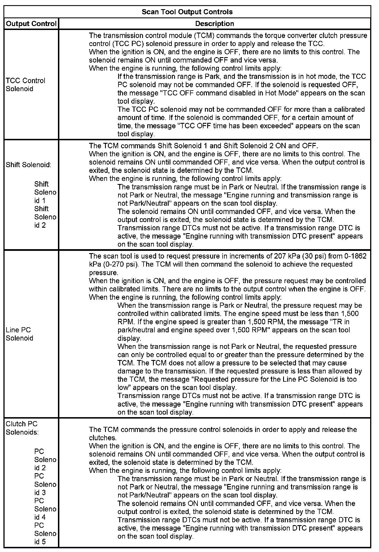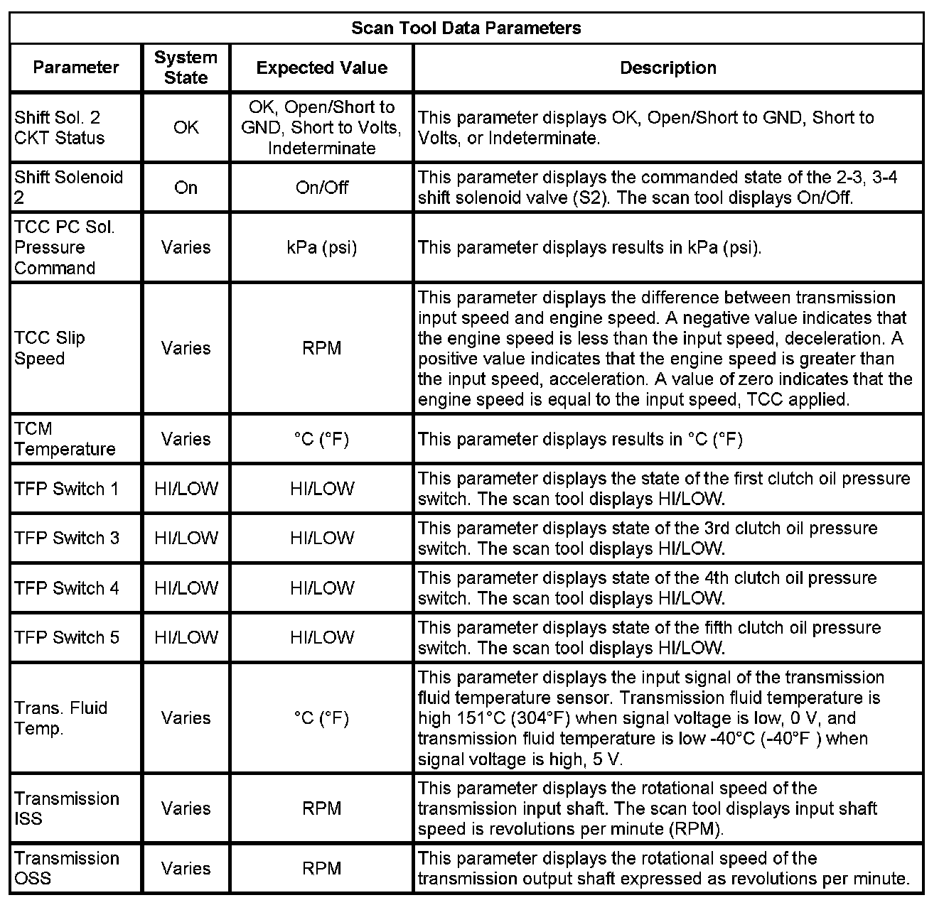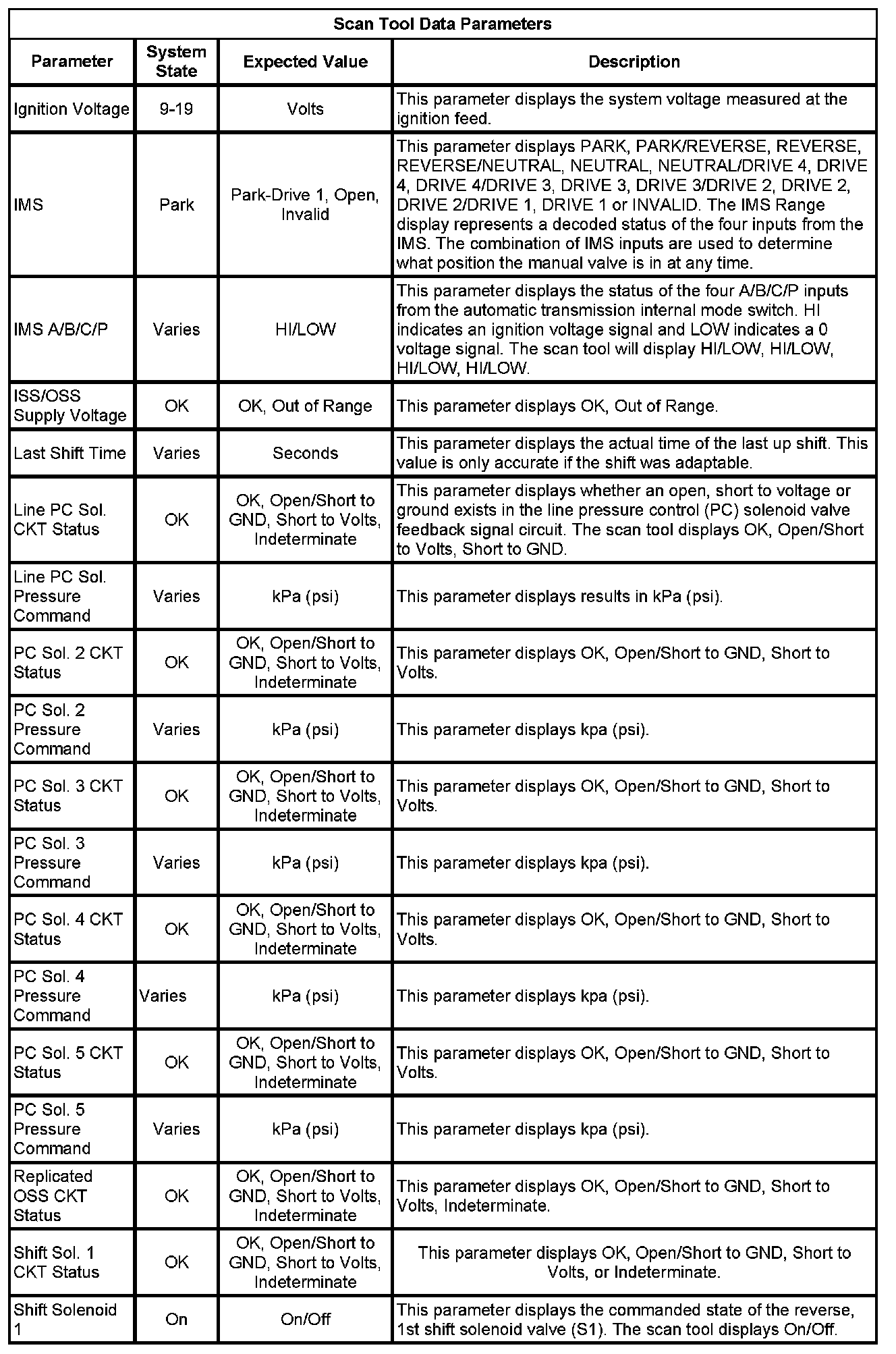 The Transmission Control Module Scan Tool Data List contains all transmission related parameters that are available on the scan tool. The list is arranged in alphabetical order. A given parameter may appear in any one of the data lists, and in some cases may appear more than once, or in more than one data list in order to group certain related parameters together.