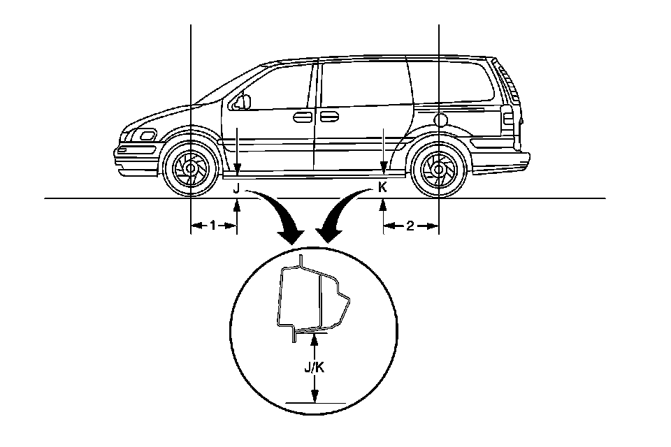 3. Measure the J dimension for the left and right side of the vehicle 604 mm (24 in) from the centerline of the FRONT wheel (1).