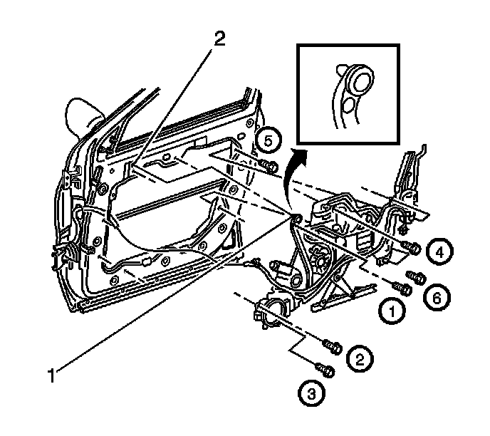 9. Pull the door harness through hinge face into door cavity and remove the door module (1).