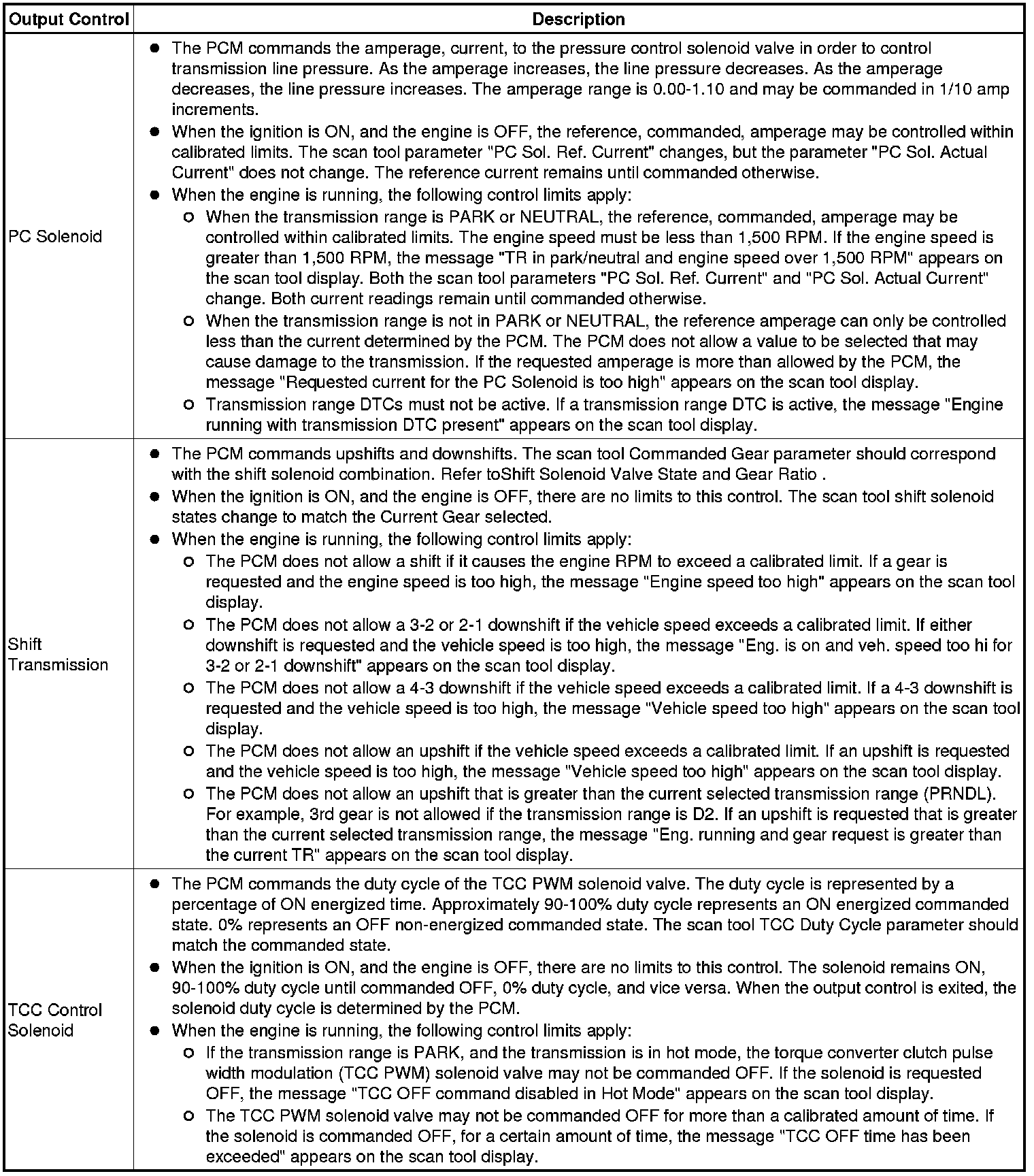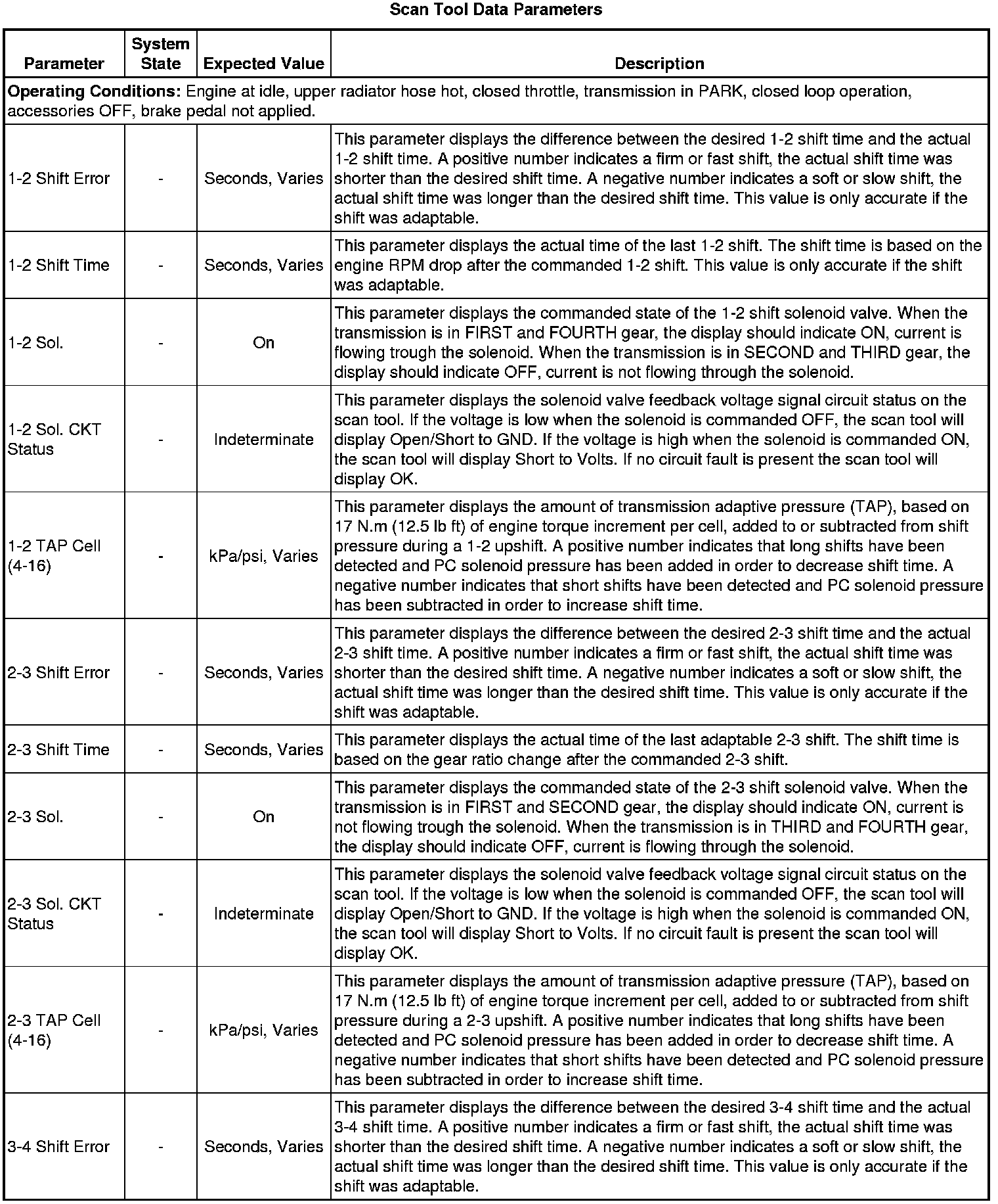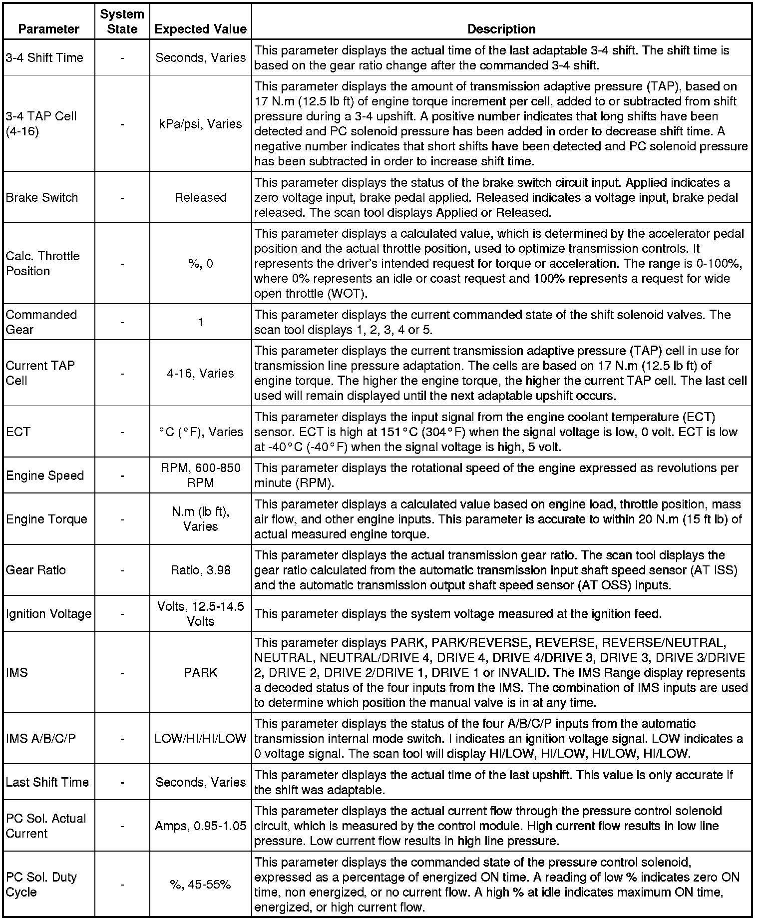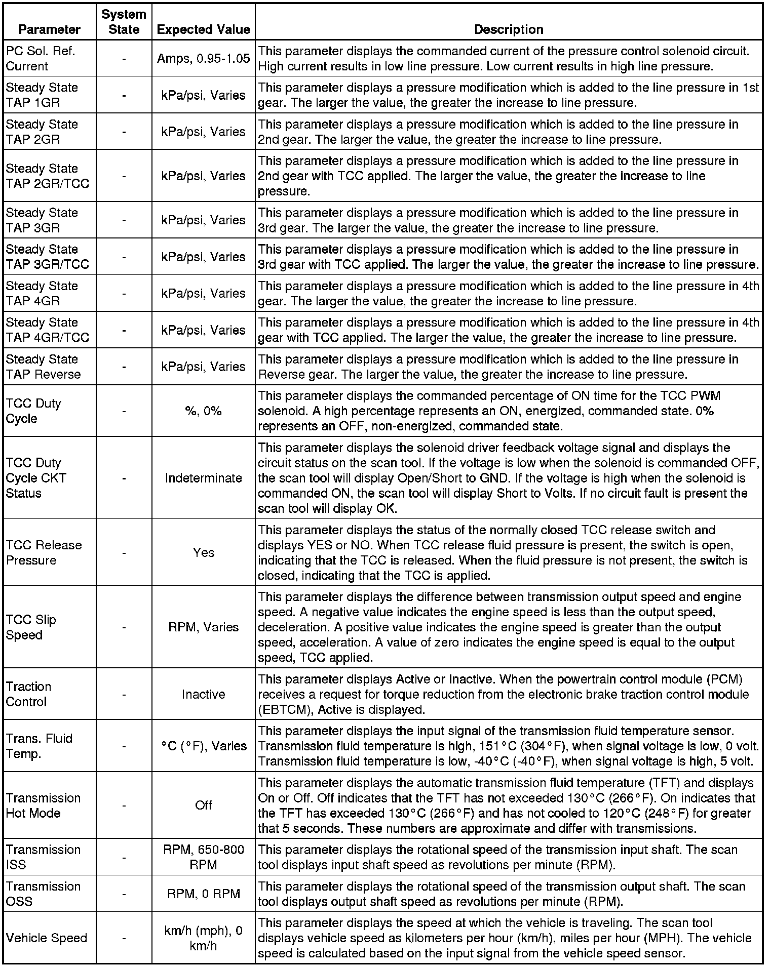 The Transmission Control Module Scan Tool Data List contains all transmission related parameters that are available on the scan tool. The list is arranged in alphabetical order. A given parameter may appear in any one of the data lists, and in some cases may appear more than once, or in more than one data list in order to group certain related parameters together.