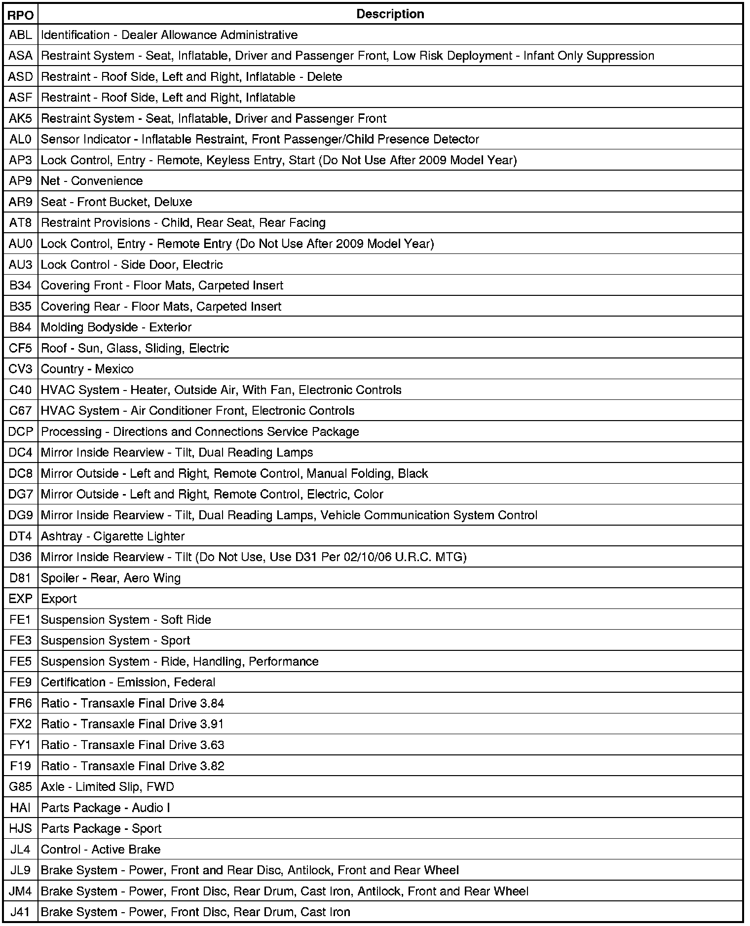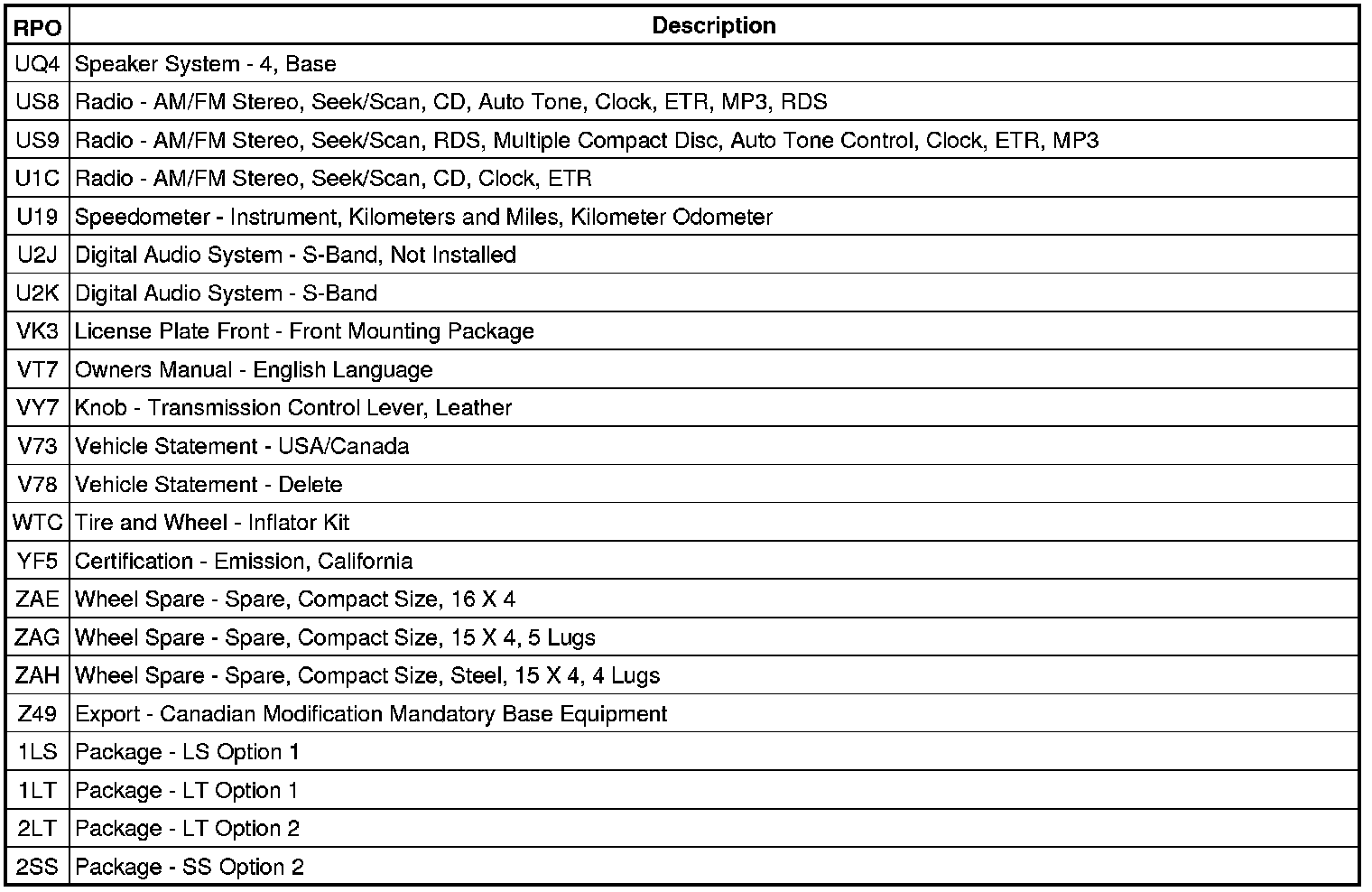 The following table provides the description of the Regular Production Option (RPO) codes that are available on the vehicle. The vehicle's RPO list is printed on the Service Parts Identification Label.