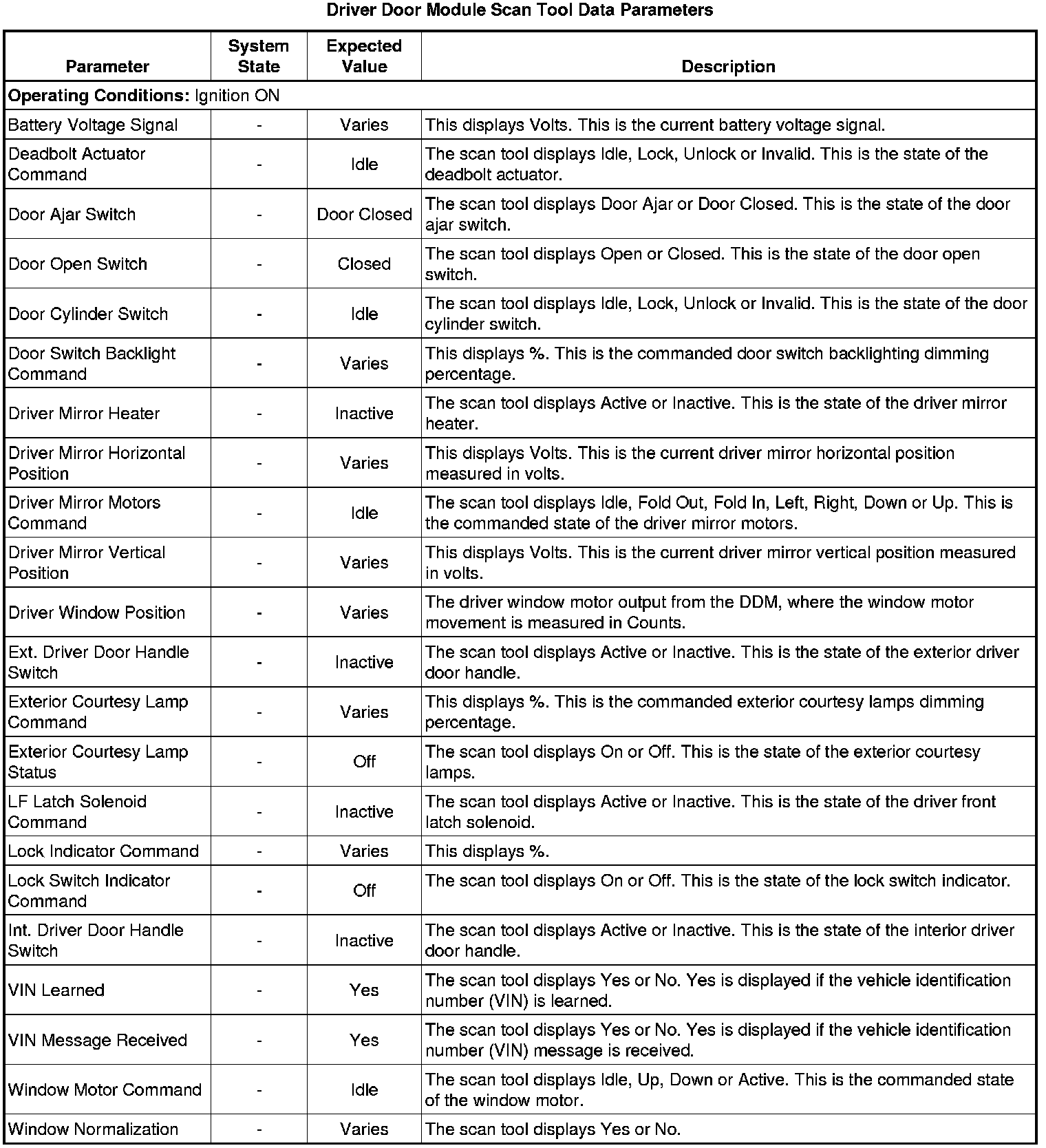 Door Lock Control Module Scan Tool Information (Driver Door Module)
