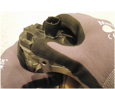 7. Hold the throttle body with your hand, so that the throttle position (TP) sensor cover is facing upward as shown.