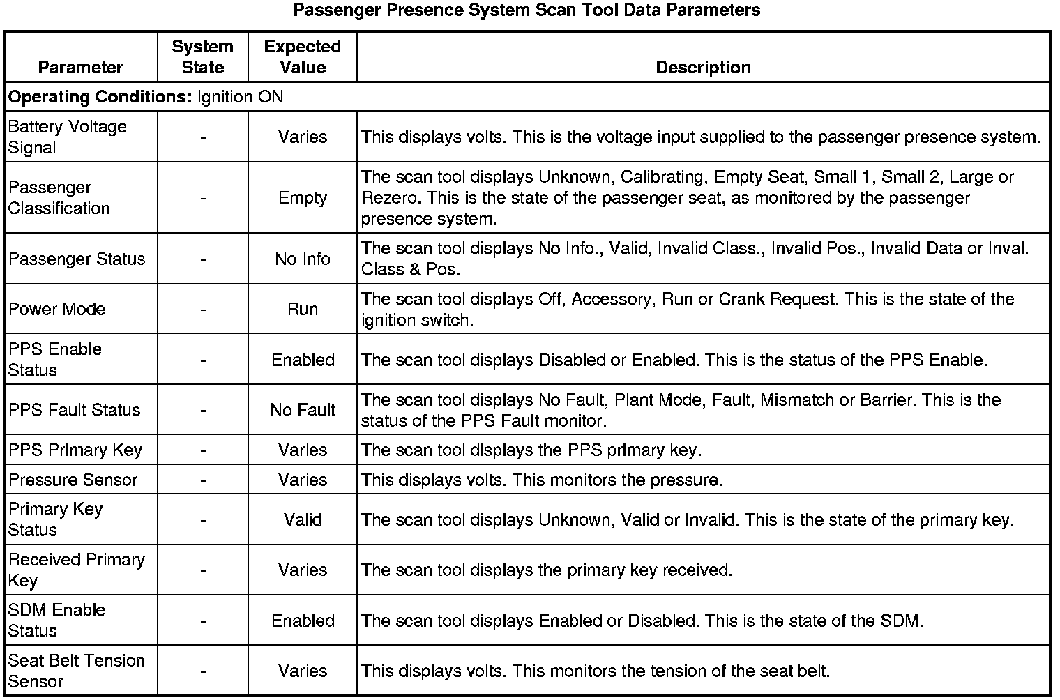 Inflatable Restraint Passenger Presence System Scan Tool Information
