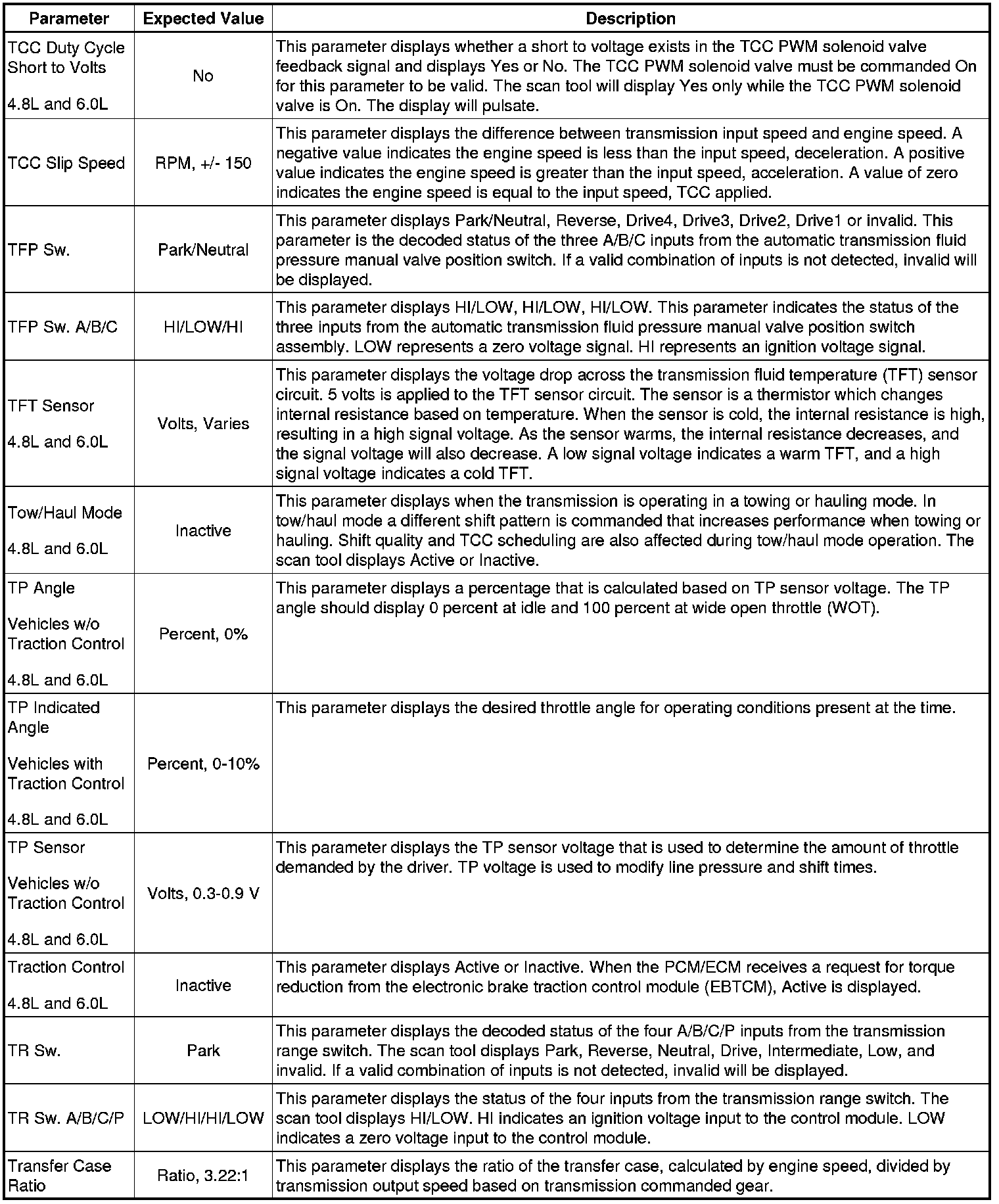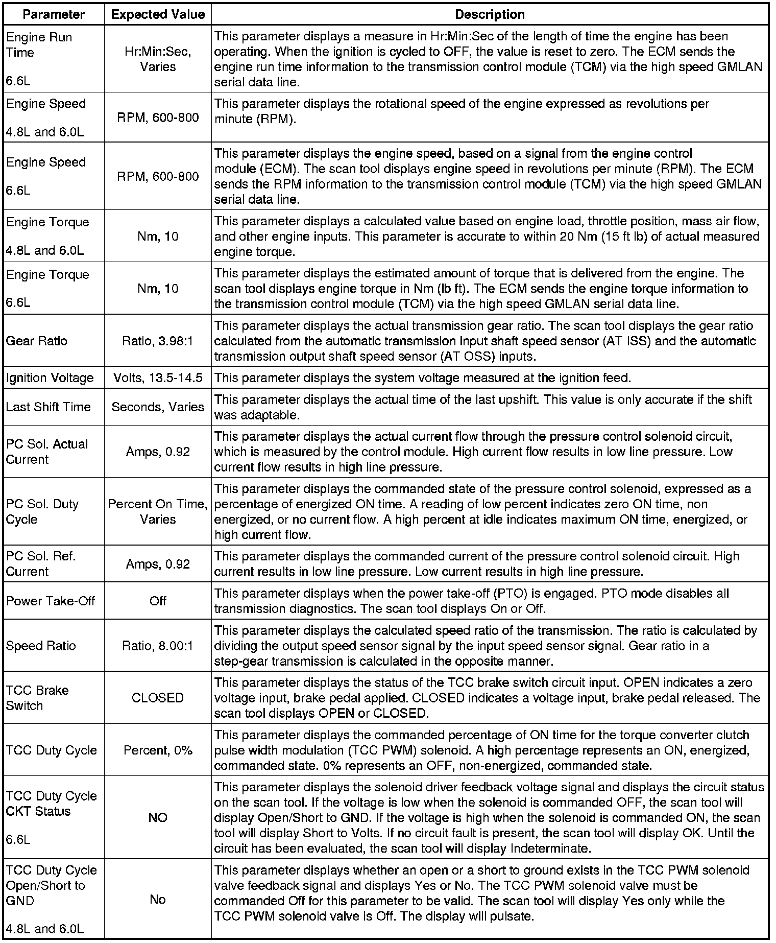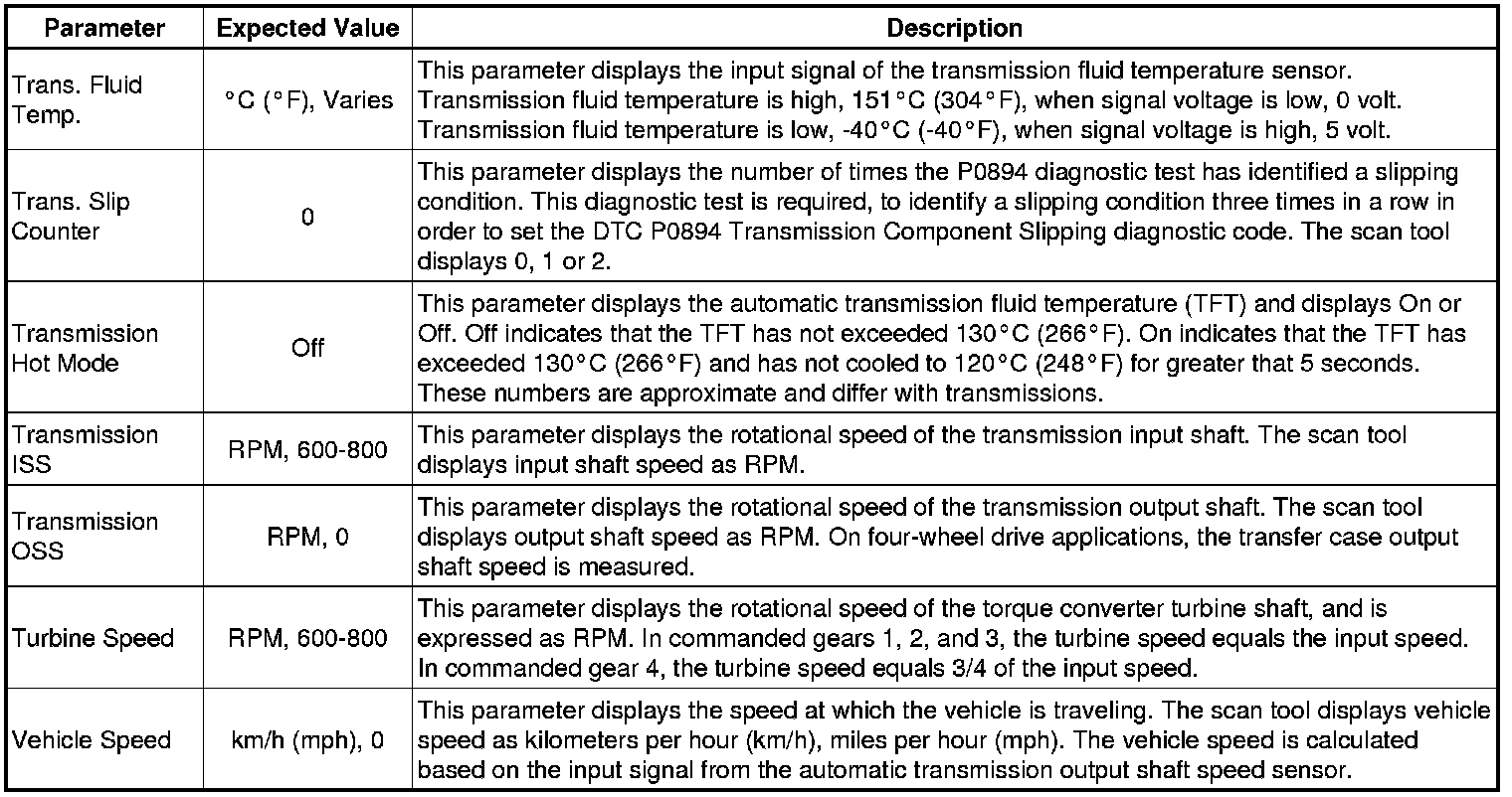 The Transmission Control Module Scan Tool Data List contains all transmission related parameters that are available on the scan tool. The list is arranged in alphabetical order. A given parameter may appear in any one of the data lists, and in some cases may appear more than once, or in more than one data list in order to group certain related parameters together.
