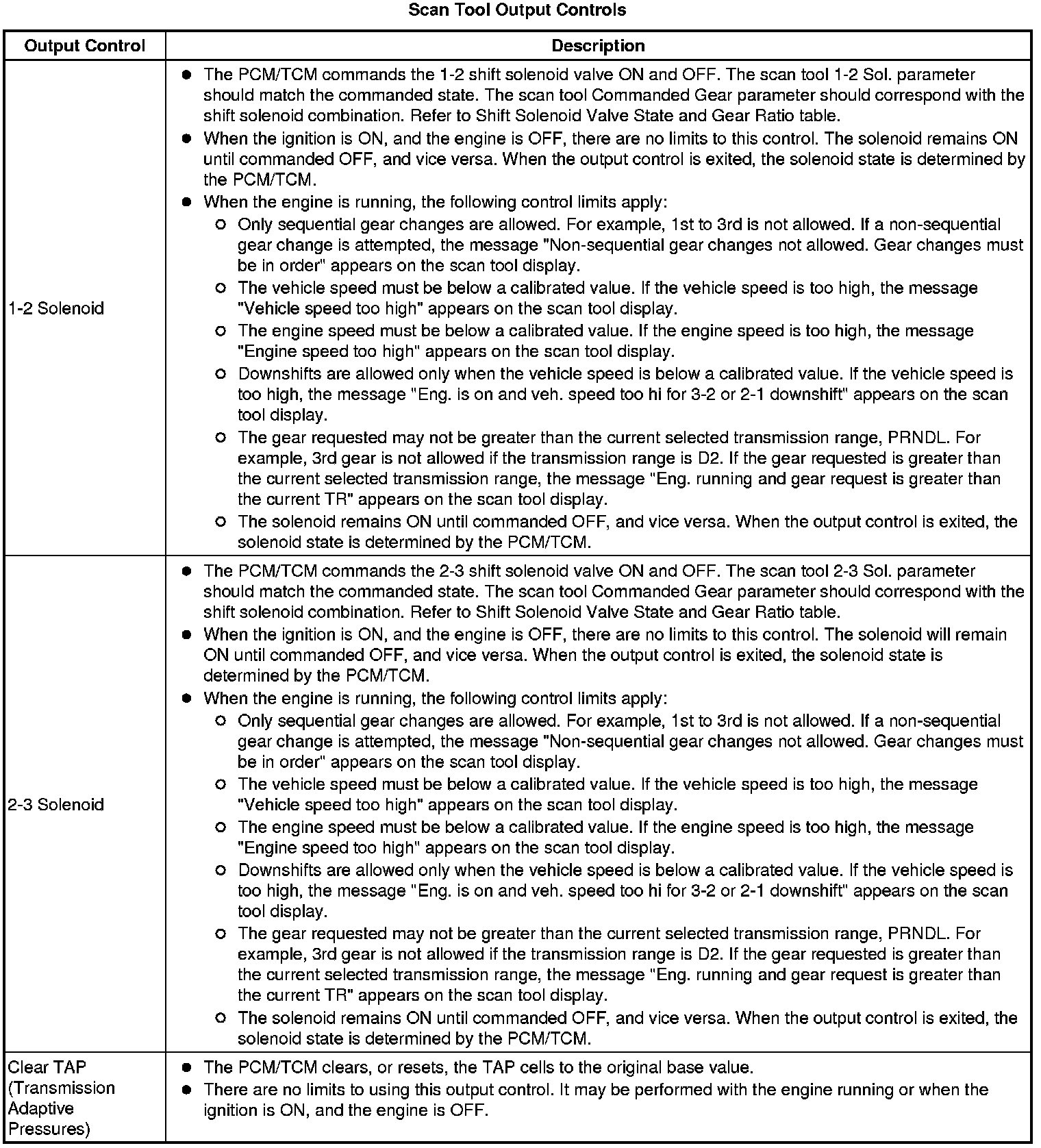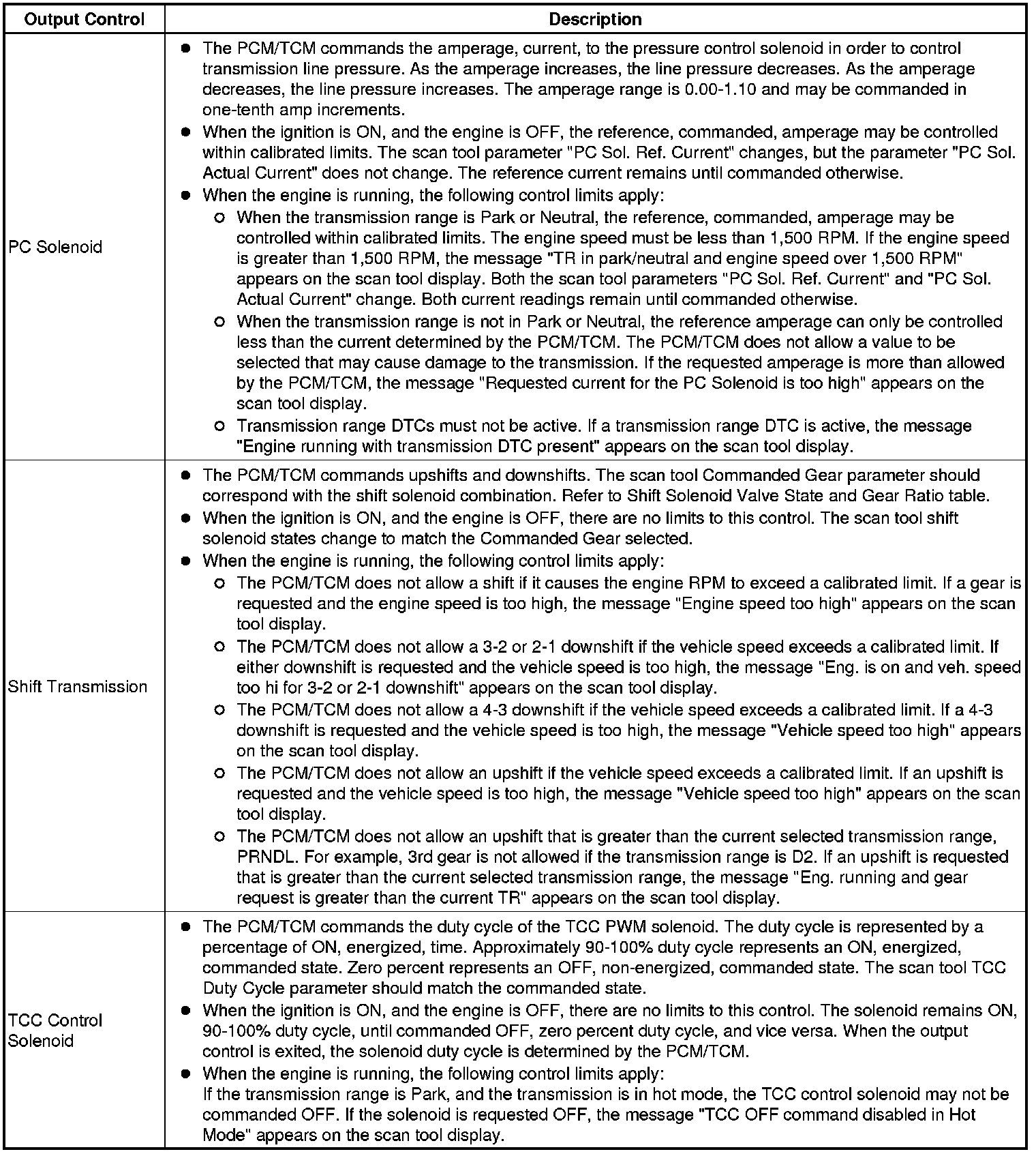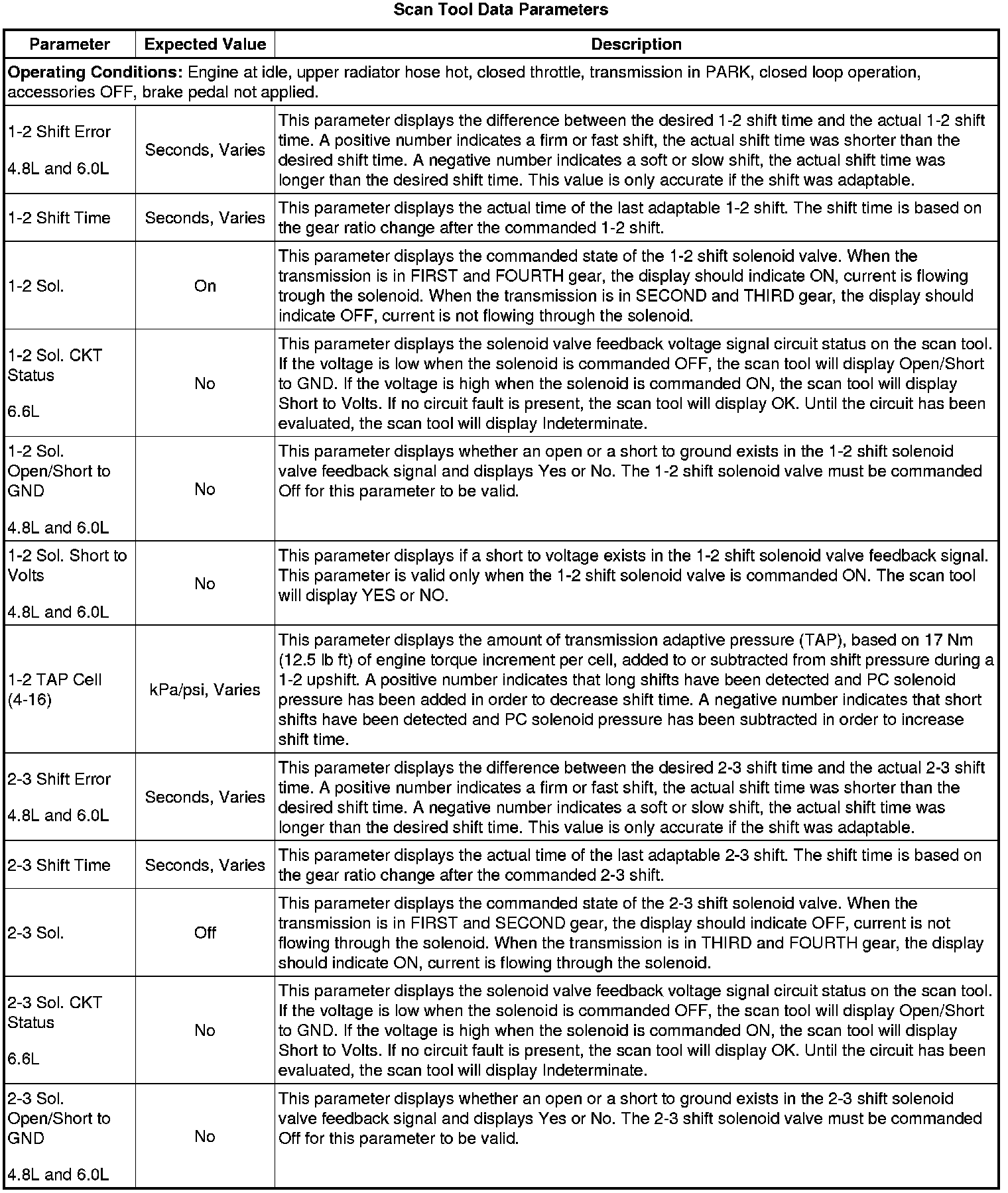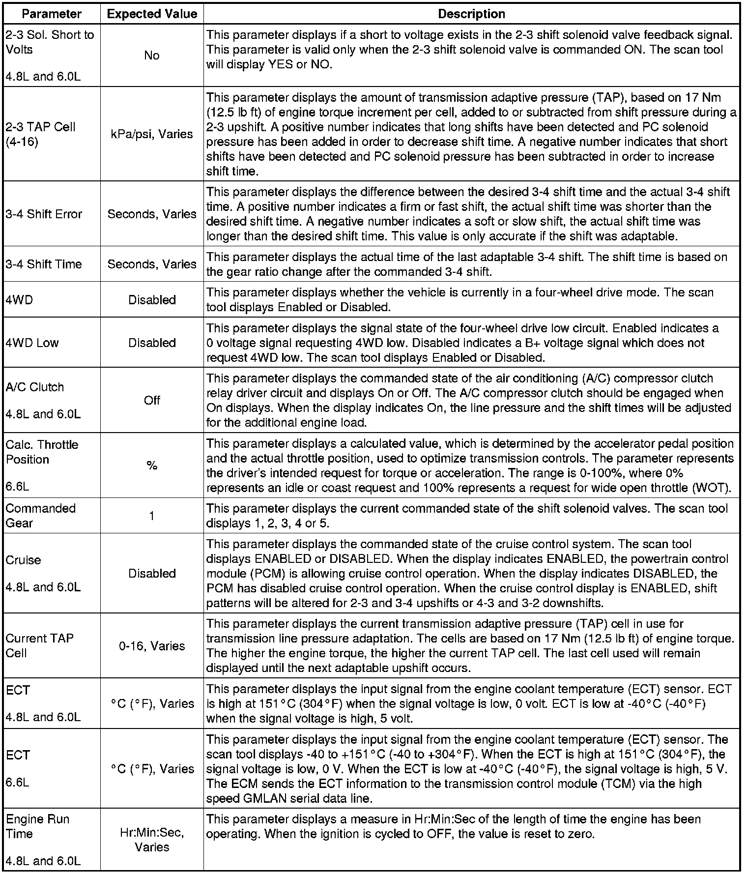 The Transmission Control Module Scan Tool Data List contains all transmission related parameters that are available on the scan tool. The list is arranged in alphabetical order. A given parameter may appear in any one of the data lists, and in some cases may appear more than once, or in more than one data list in order to group certain related parameters together.