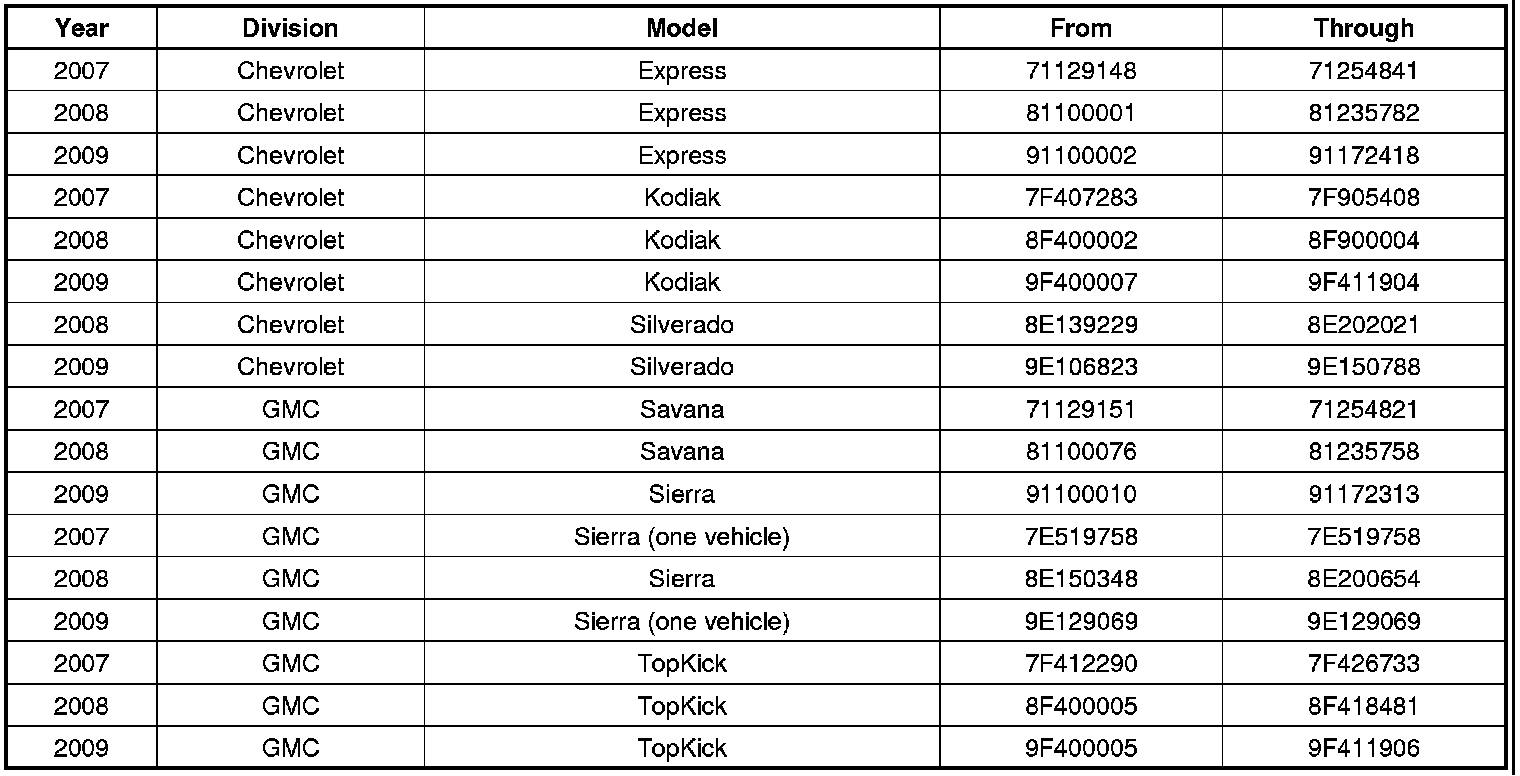 Involved are certain 2007-2009 model year Chevrolet Express and Kodiak; 2008-2009 model year Chevrolet Silverado; and 2007-2009 model year GMC Savana, Sierra, and TopKick vehicles equipped with a Duramax 6.6L diesel engine (LMM), and built within these VIN breakpoints: