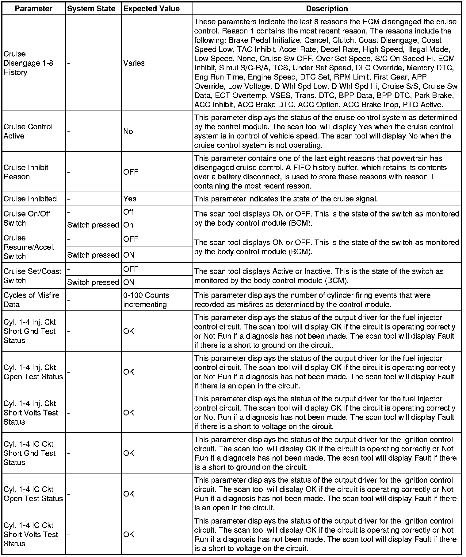 The Engine Control Module Scan Tool Data List contains all engine-related parameters that are available on the scan tool. The list is arranged in alphabetical order. A given parameter may appear in any one of the data lists, and in some cases may appear more than once, or in more than one data list in order to group certain related parameters together.