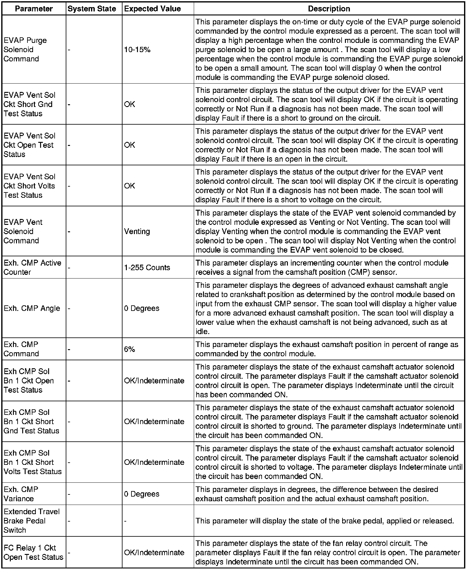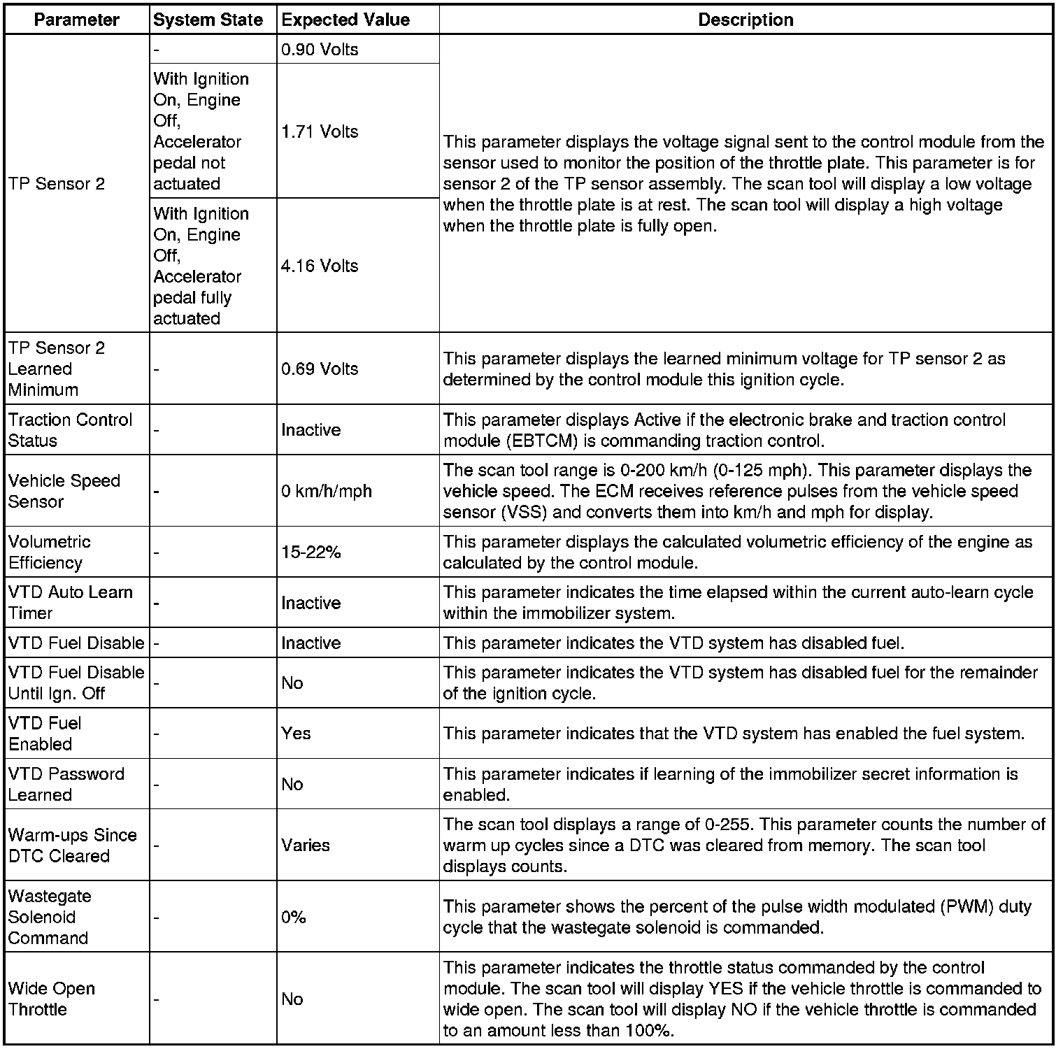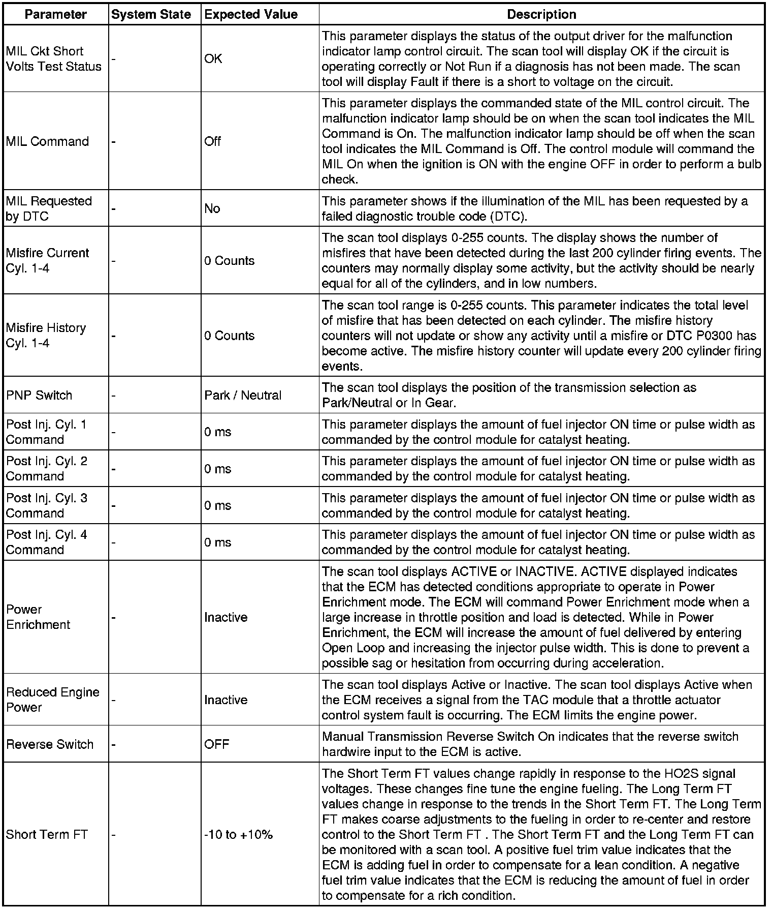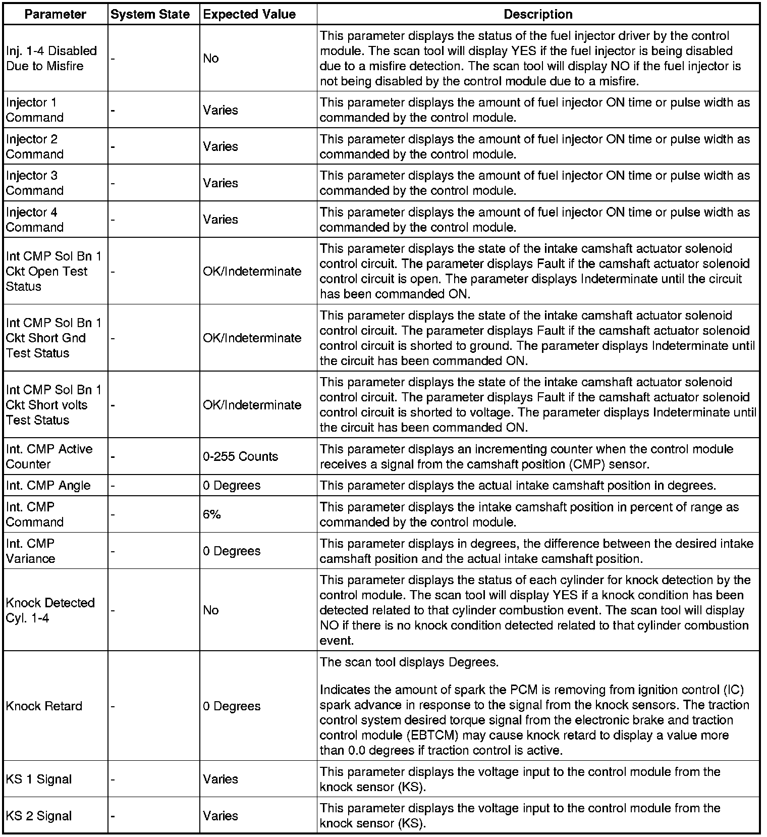 Only the parameters listed below are referenced in this service manual for use in diagnosis. If all values are within the typical range described below, refer to Symptoms - Engine Controls (- Symptoms - Engine Controls) for the 2.0L engine for diagnosis.