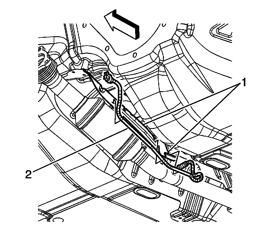 3. Install the HO2S electrical harness lead (2) into the trough (1) on the exhaust heat shield, and bend the trough up slightly.