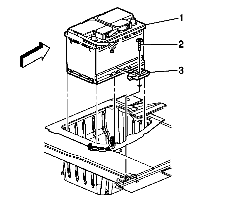 10. Remove the battery hold down (3).