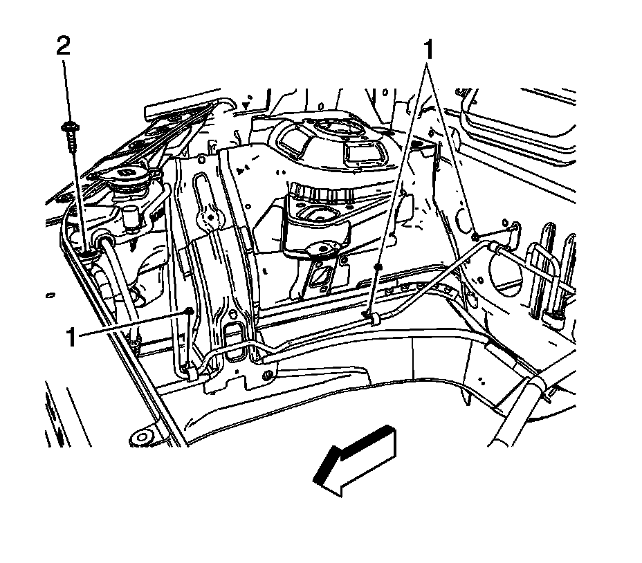 6. Install the power steering reservoir inlet hose clip (1) to the power steering fluid reservoir hose clip bracket (2).