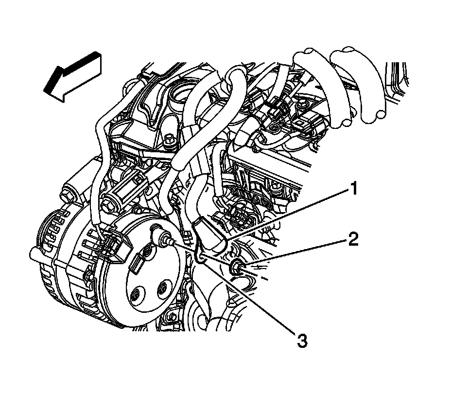 16. Remove the power steering fluid reservoir hose clip bracket (3) from against the generator.