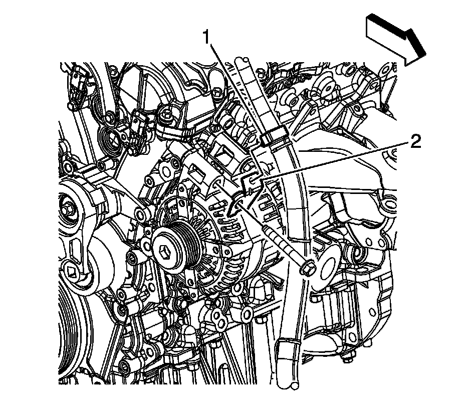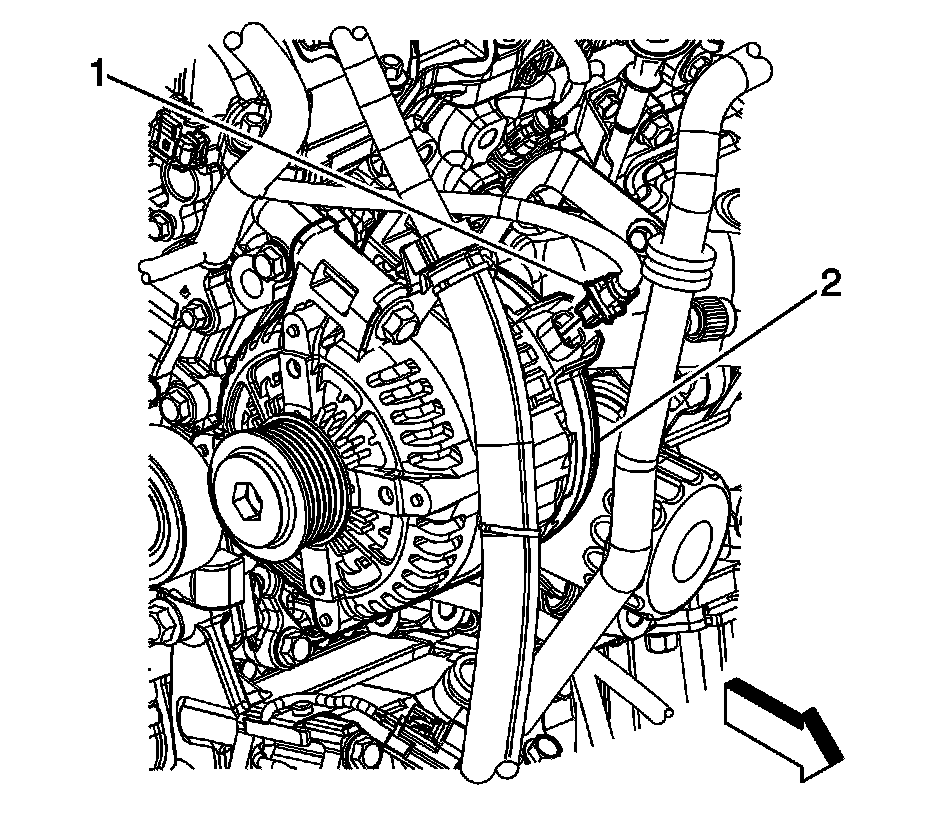 4. Install the A/C compressor/evaporator hose bracket (2) onto the other generator bolt, and install the bolt finger tight.