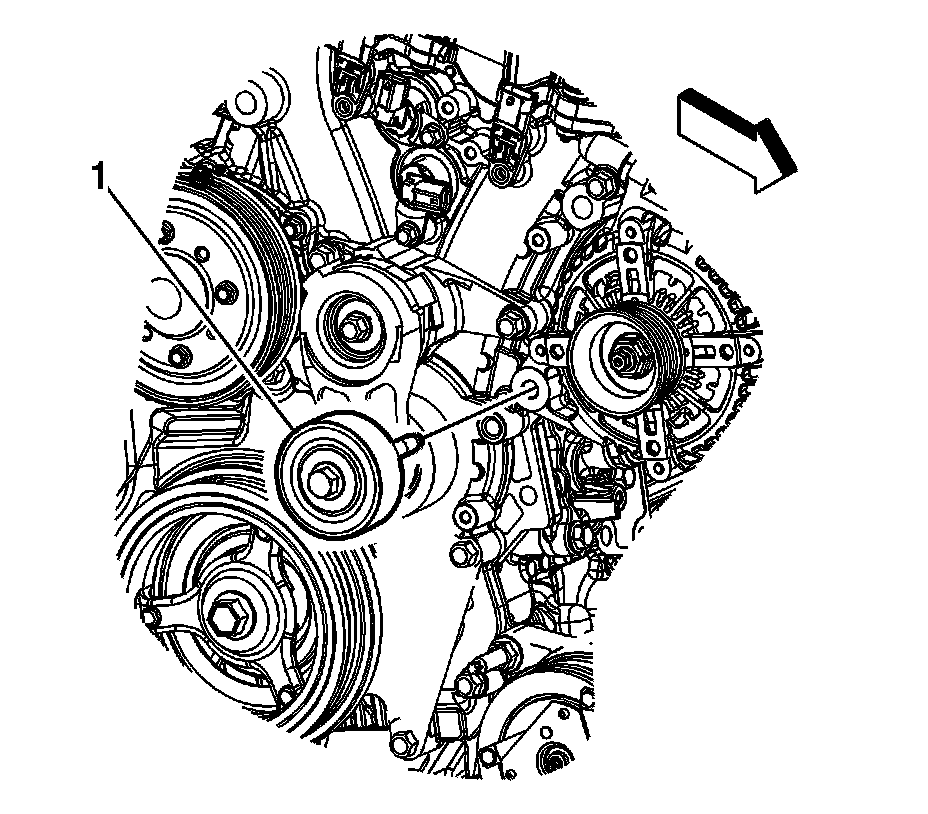 13. Loosen the idler pulley (1) bolt and slide the pulley out as far as possible.
