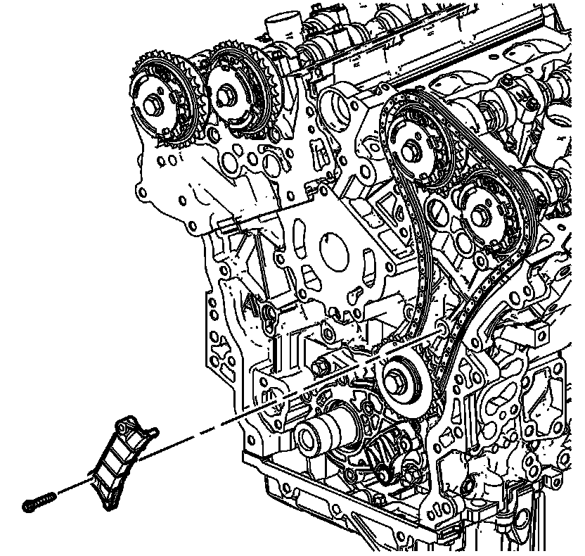 4. Remove the left bank secondary camshaft drive chain guide. 27. Secondary Camshaft Drive Chain Guide Removal - Left Side