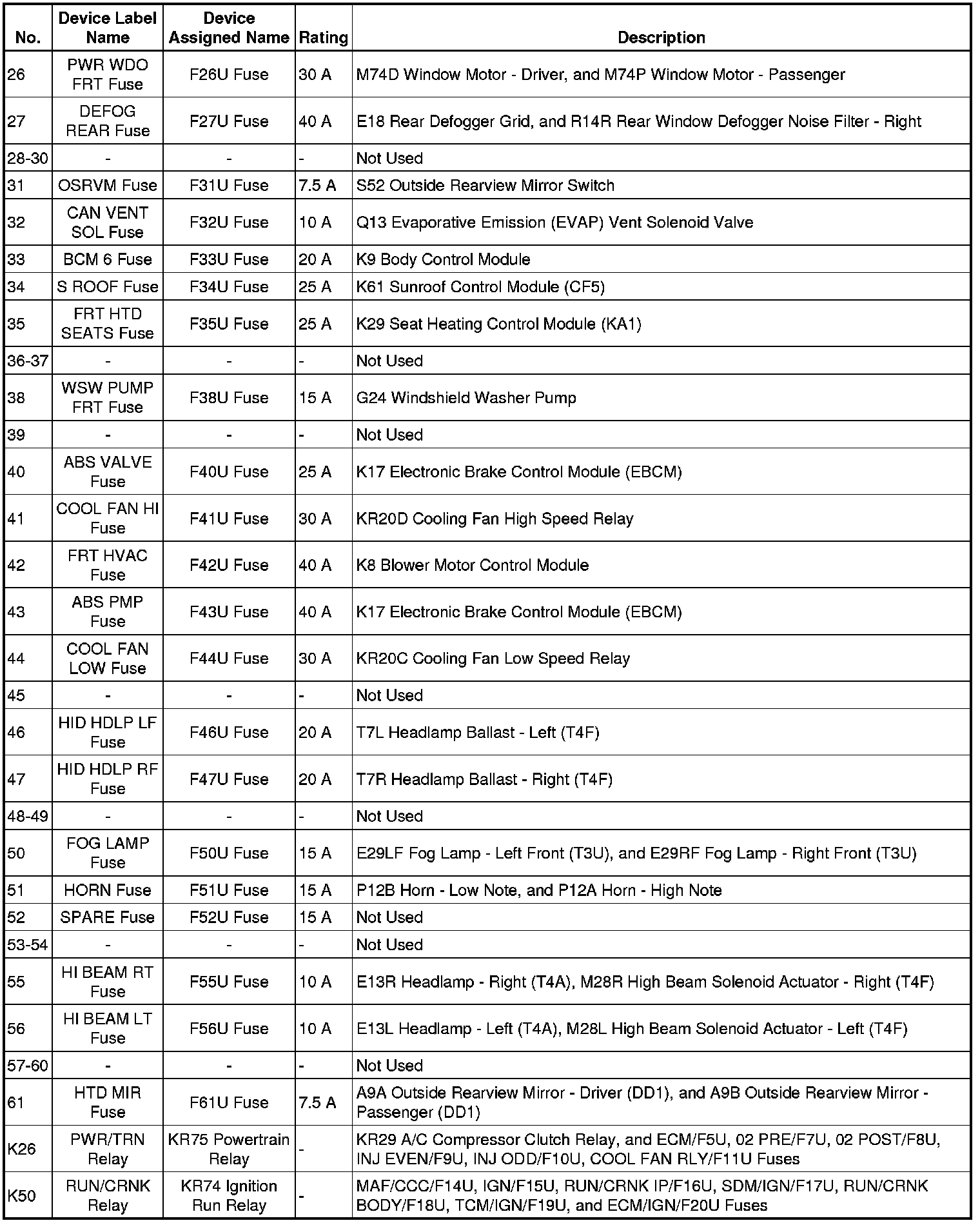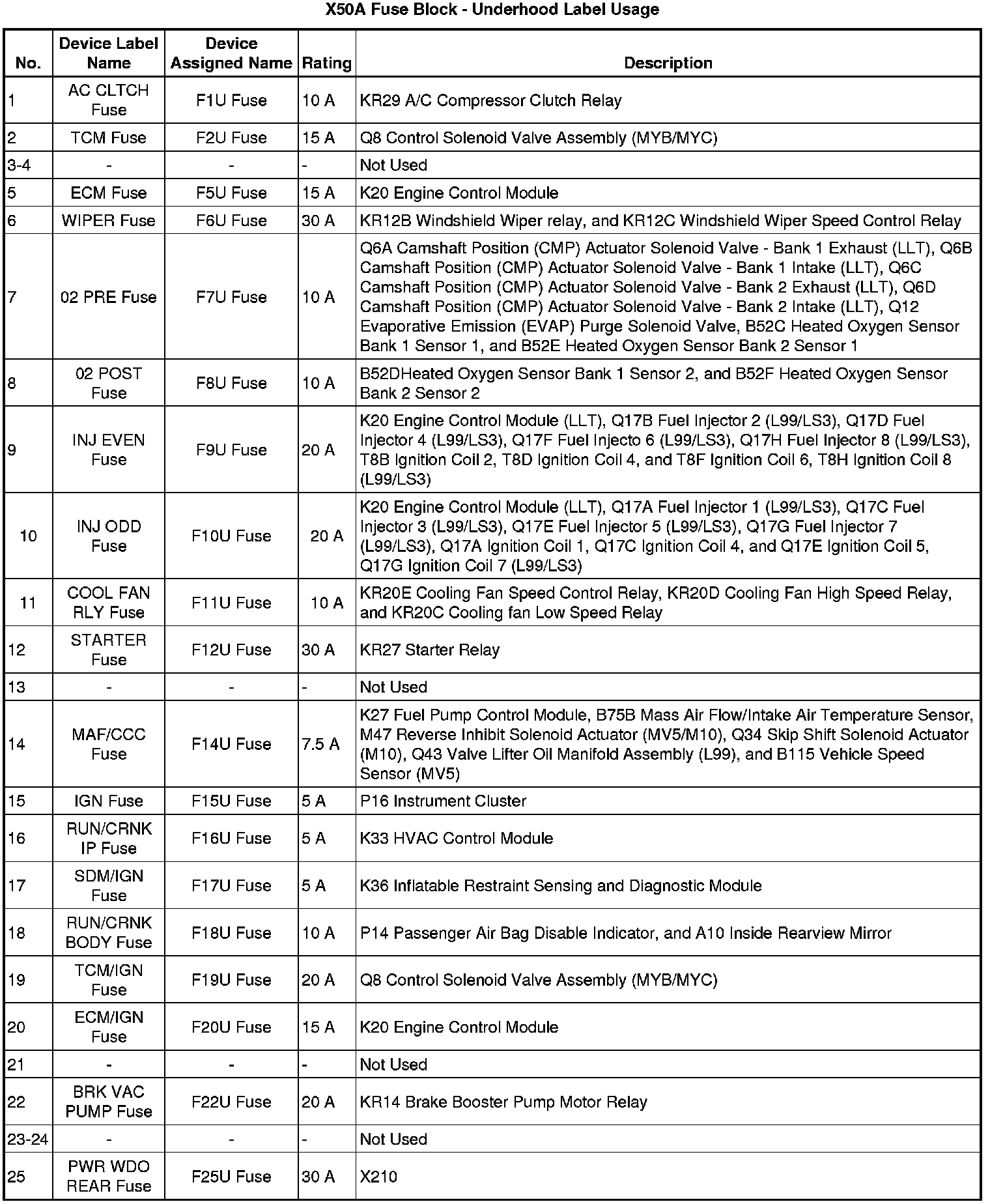 X50A Fuse Block - Underhood Label