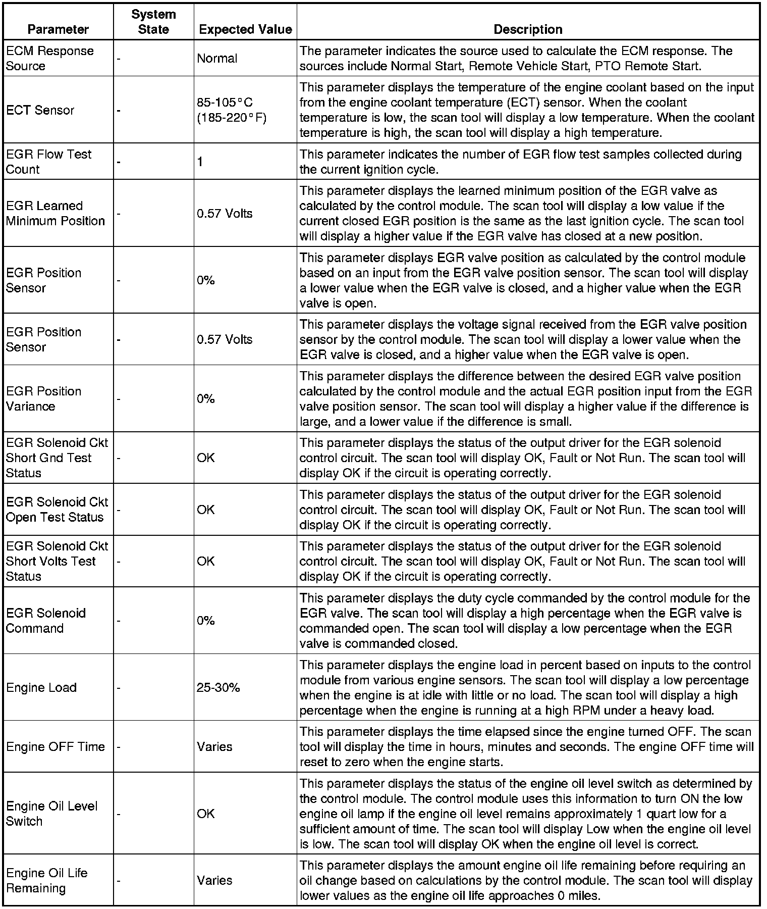 The scan tool values from a properly running engine may be used for comparison with the engine you are diagnosing. The engine scan tool data list represents values that would be seen on a normally running engine.