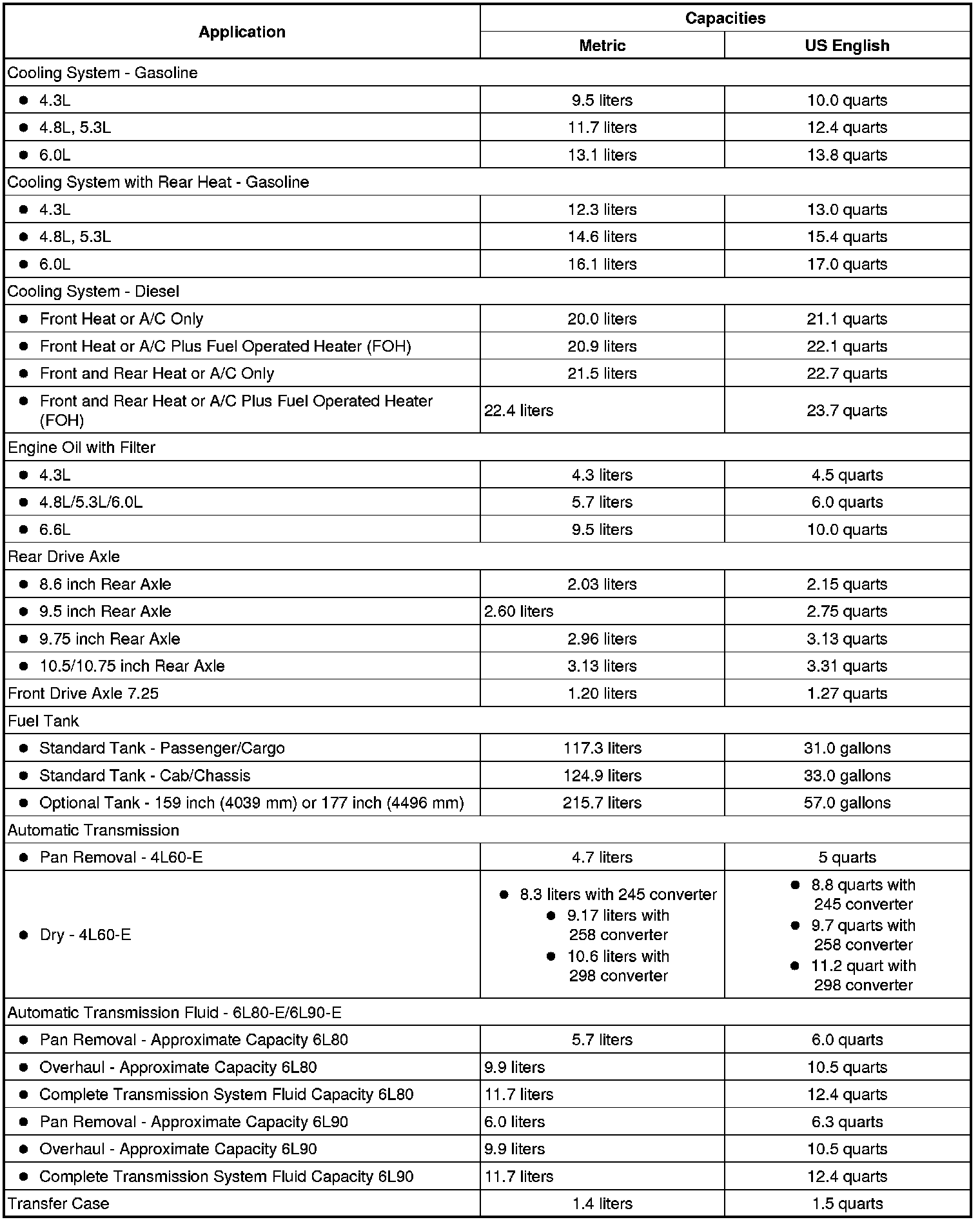 The following approximate capacities are given in US English and metric conversions. See Fluid and Lubricant Recommendations (USA and Canada) (Maintenance) for more information. All capacities are approximate. When adding, be sure to fill to the approximate level, as recommended in this manual. Recheck fluid level after filling.