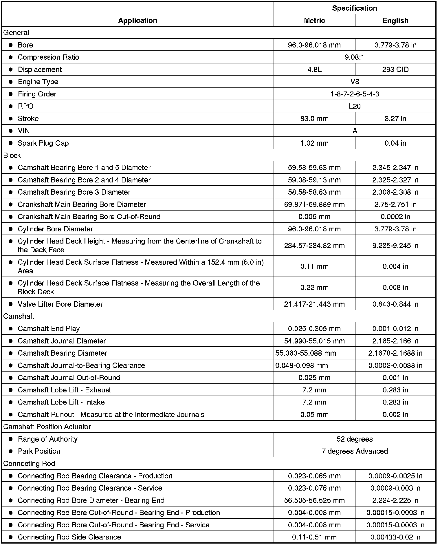 Engine Mechanical Specifications (RPO L20 VIN A)