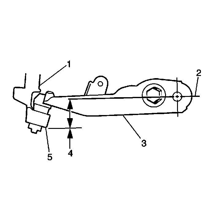 3. Measure from the pivot bolt center line (2) down to the lower corner (5) of the steering knuckle (1) in order to obtain the Z height measurement (4).