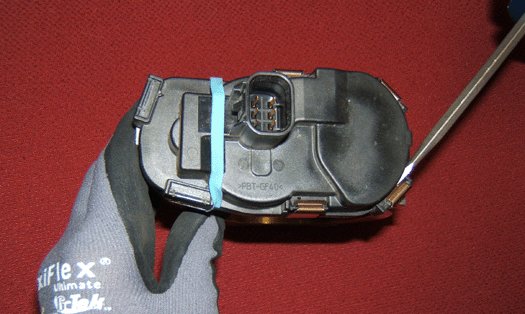 10. Turn over the throttle body and use a flathead screwdriver to remove the four remaining clips from the TP sensor cover. Discard the clips.