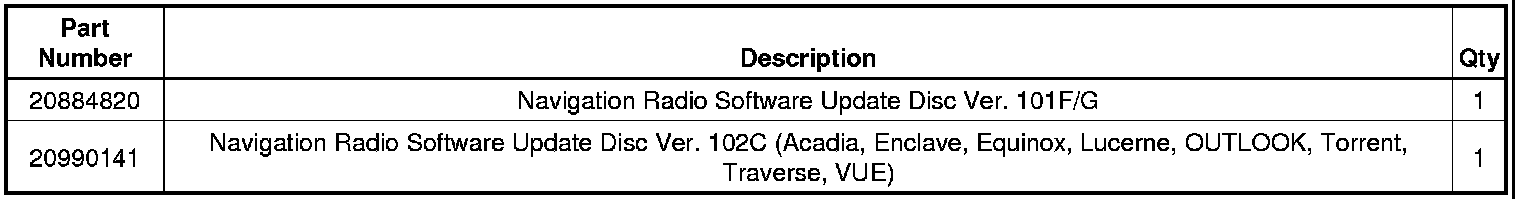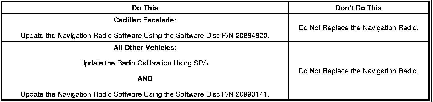 Technicians are to update the navigation radio software using a software update disc, P/N 20884820. The software update disc is to be obtained from the GM Navigation Disc Center, using the GM Navigation Disc Center Contact Information below.