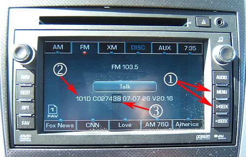 2. Proceed to the FM audio screen and confirm the current navigation software version by pressing the MENU and SEEK UP buttons (1) simultaneously as indicated in the above illustration. If the screen switches, select FM to display the software version. Performing this operation may take a couple of attempts for the radio to detect the simultaneous button press. The navigation software version will be the first four characters (2), reading from the left of the display, that is located in the middle of the screen. The Radio Calibration will be the two characters (3) as indicated in the above illustration.