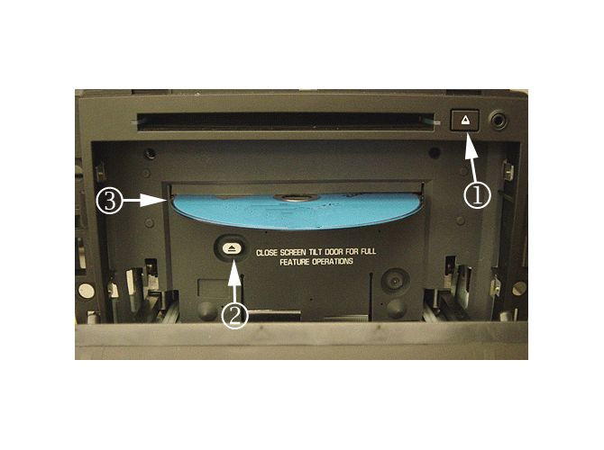 6. Open the front display by pressing and holding the EJECT button (1) for approximately 15 seconds. Eject the map disc from the revealed map DVD slot by pressing the EJECT button (2) located beneath the revealed map DVD slot (3). Load the software update disc, P/N 20990141, into the map DVD slot (3).