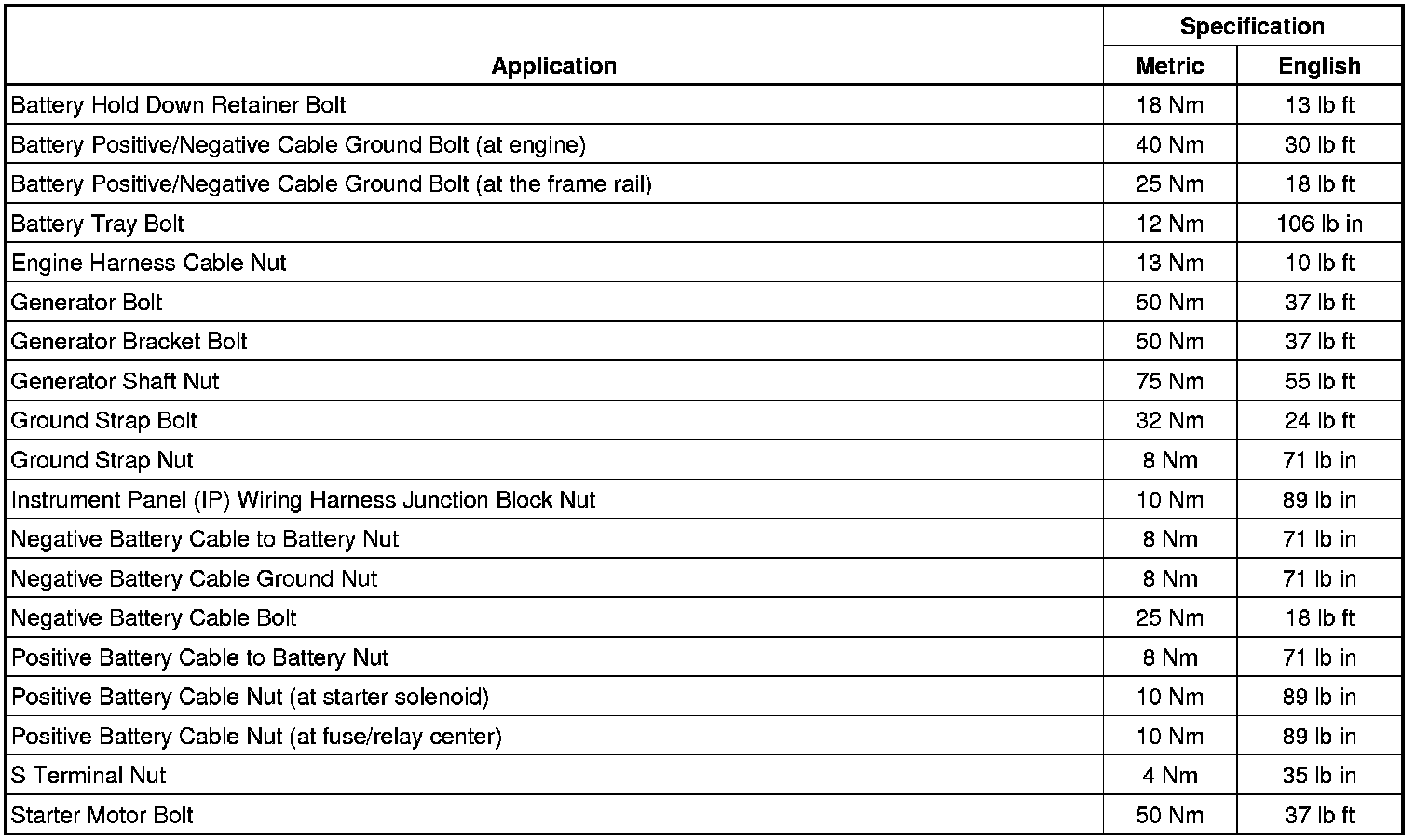 Starting and Charging: Specifications