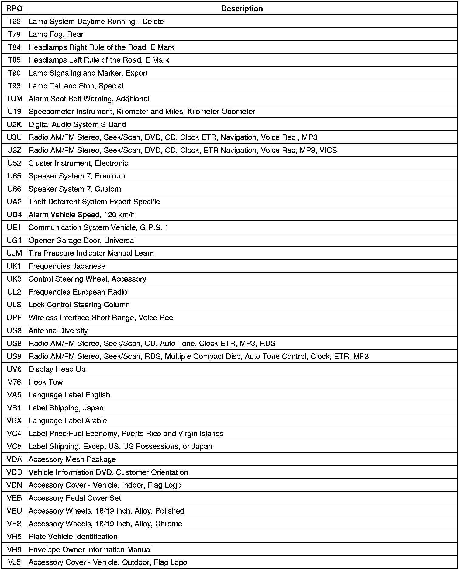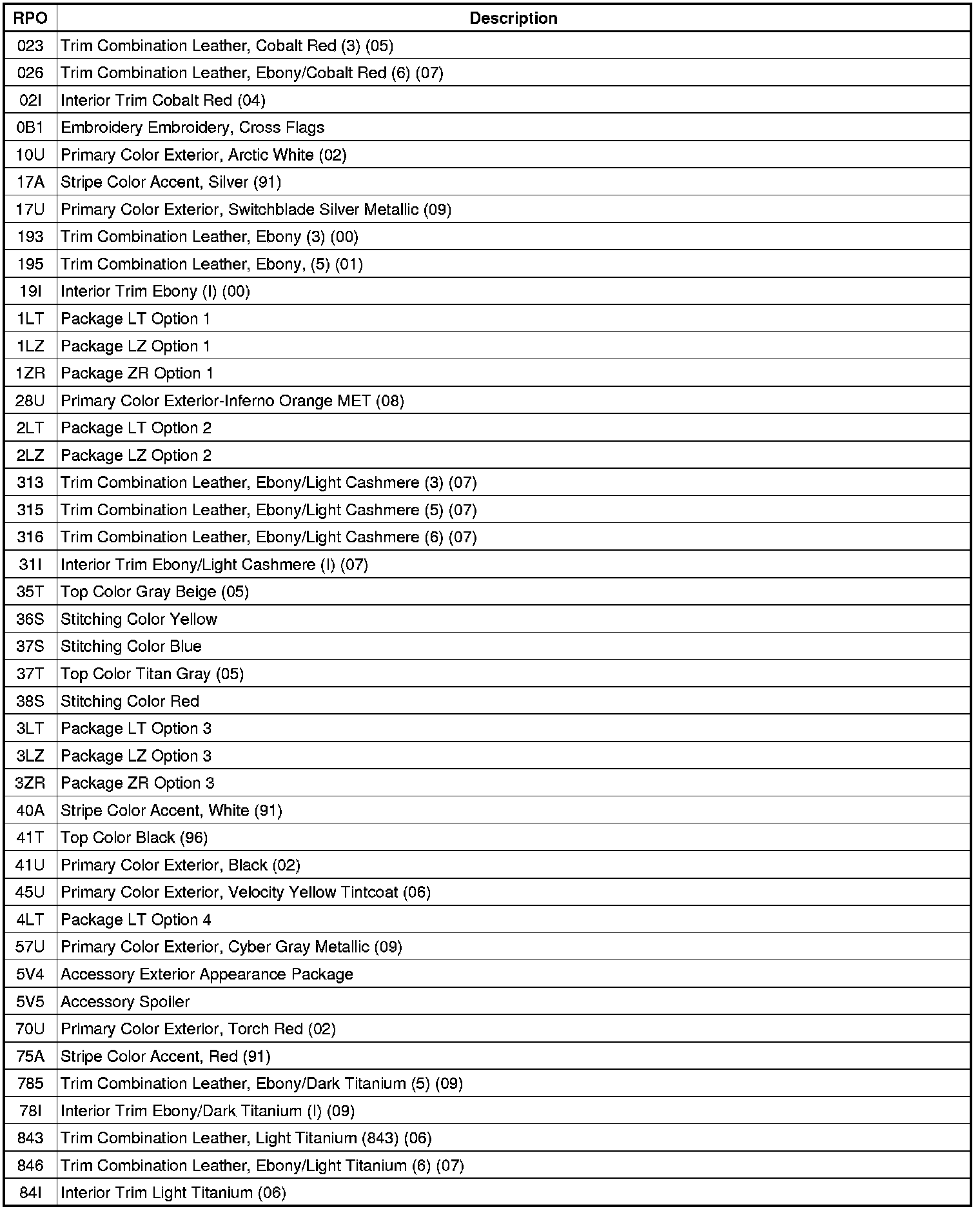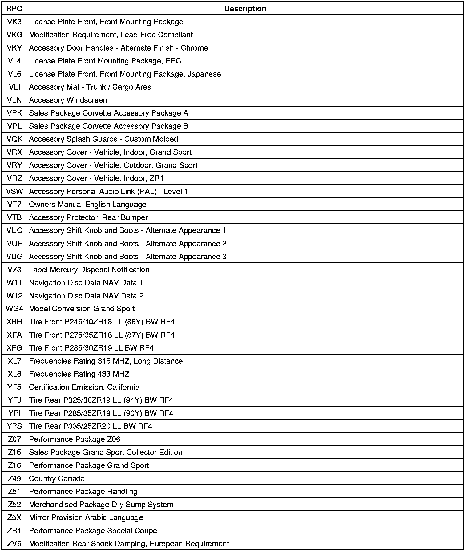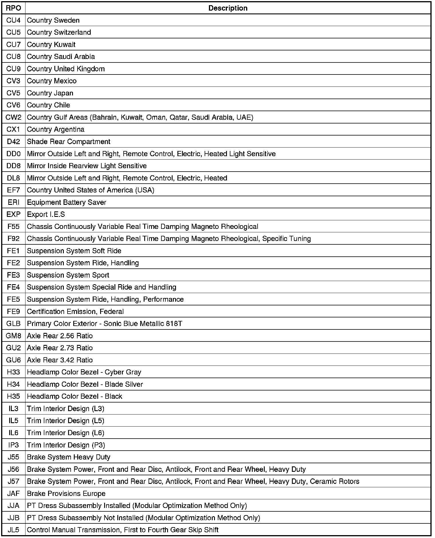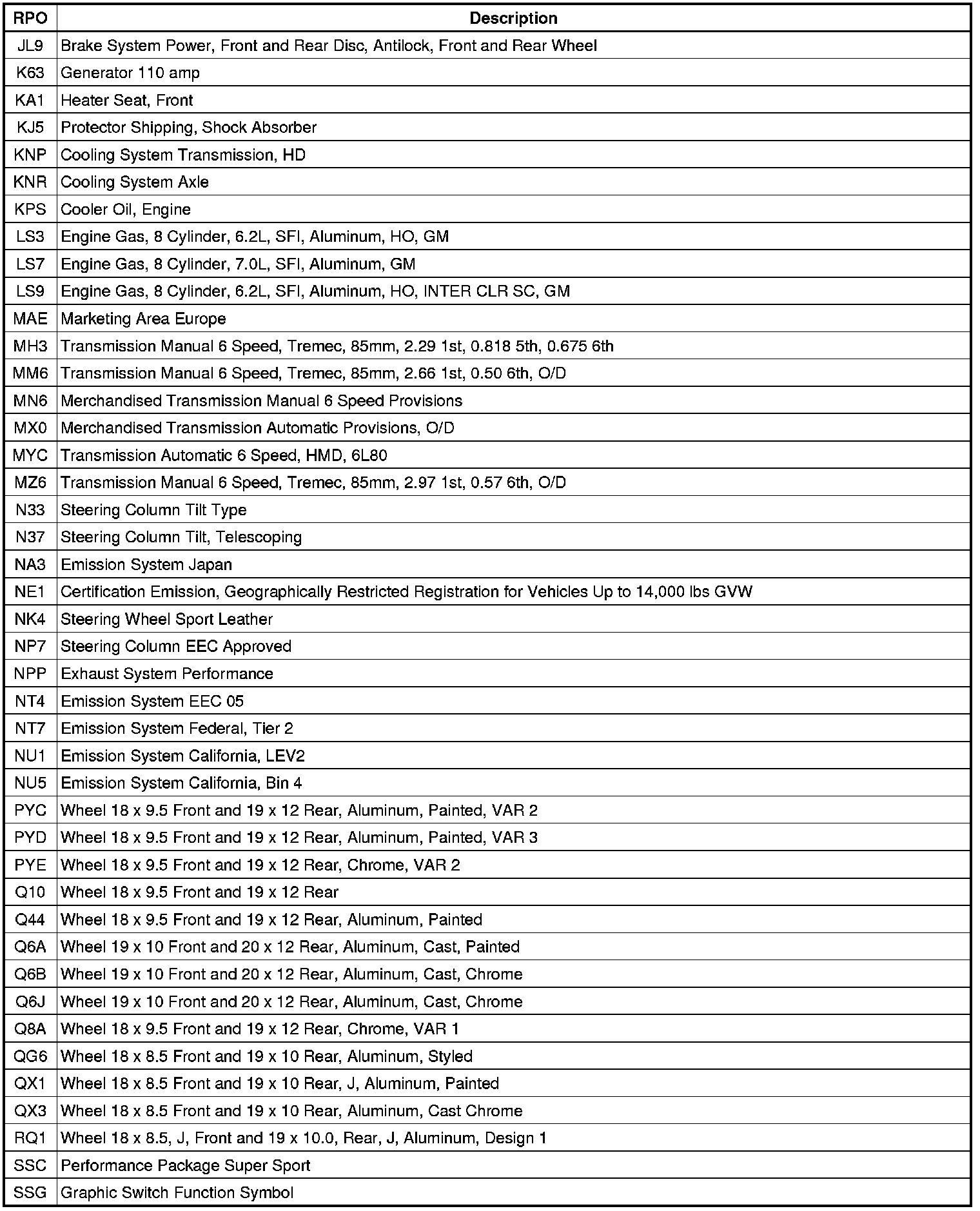 The following table provides the description of the Regular Production Option (RPO) codes that are available on the vehicle. The vehicle's RPO list is printed on the Service Parts Identification Label.