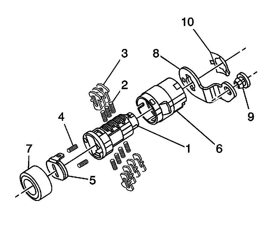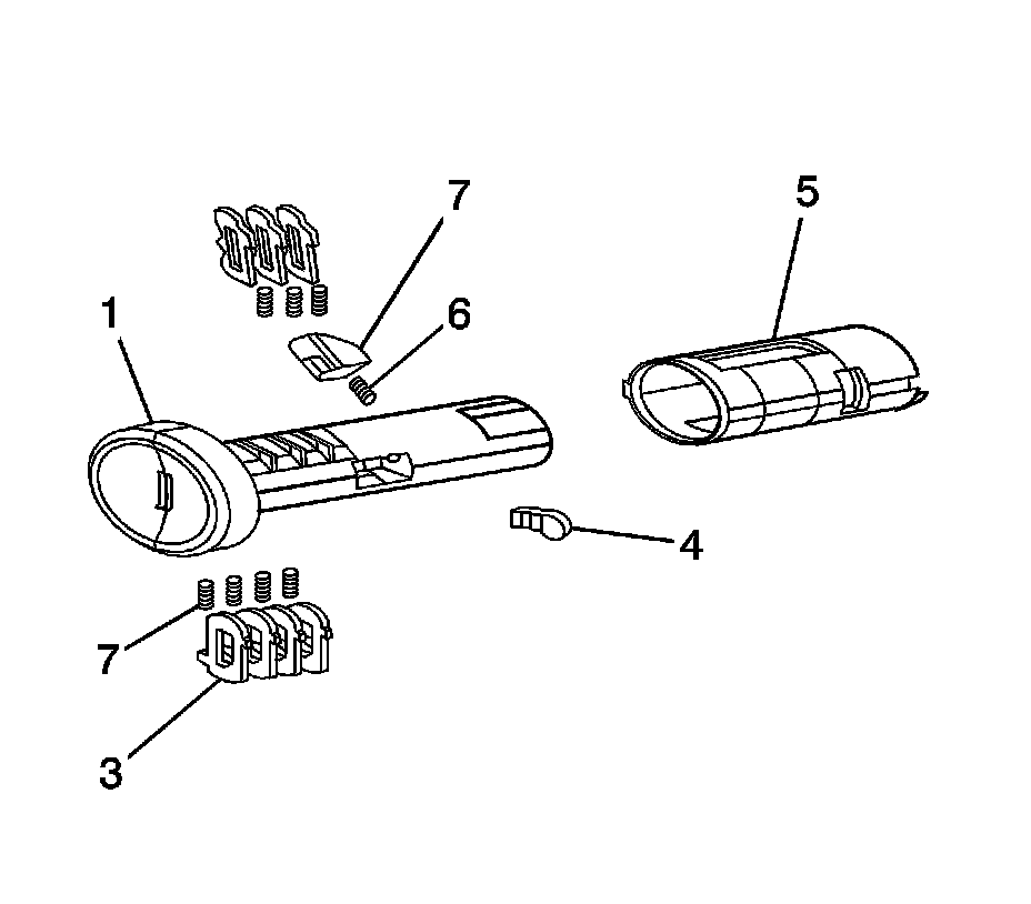 The ignition lock cylinder uses only 7 of the 10 cut positions, 2 through 8. The ignition cylinder tumblers (3) are located on alternate sides of the cylinder (1). They are snap-in and self-retaining. It follows the key code with the first tumbler being the first depth of the key code, closest to the head of the key.