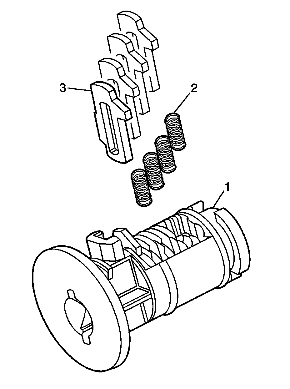 1. Hold the ignition cylinder assembly (1) so the side with the tumbler spring pocket located closest to the head of the cylinder is facing up.
