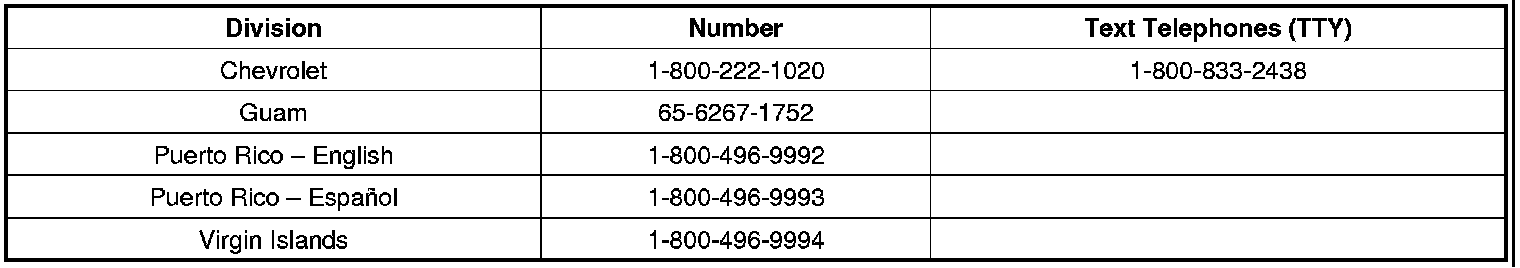 If you have any questions or concerns that your dealer is unable to resolve, please contact the Chevrolet Customer Assistance Center at the appropriate number below.