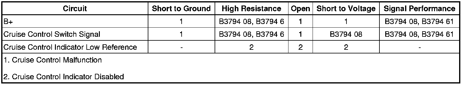 The body control module (BCM) monitors the cruise control indicator switch. When the cruise on/off switch is pressed ON, the cruise control switch is closed and the signal circuit is low. When the cruise on/off switch is pressed OFF, the cruise control switch is open and the signal circuit is high.
