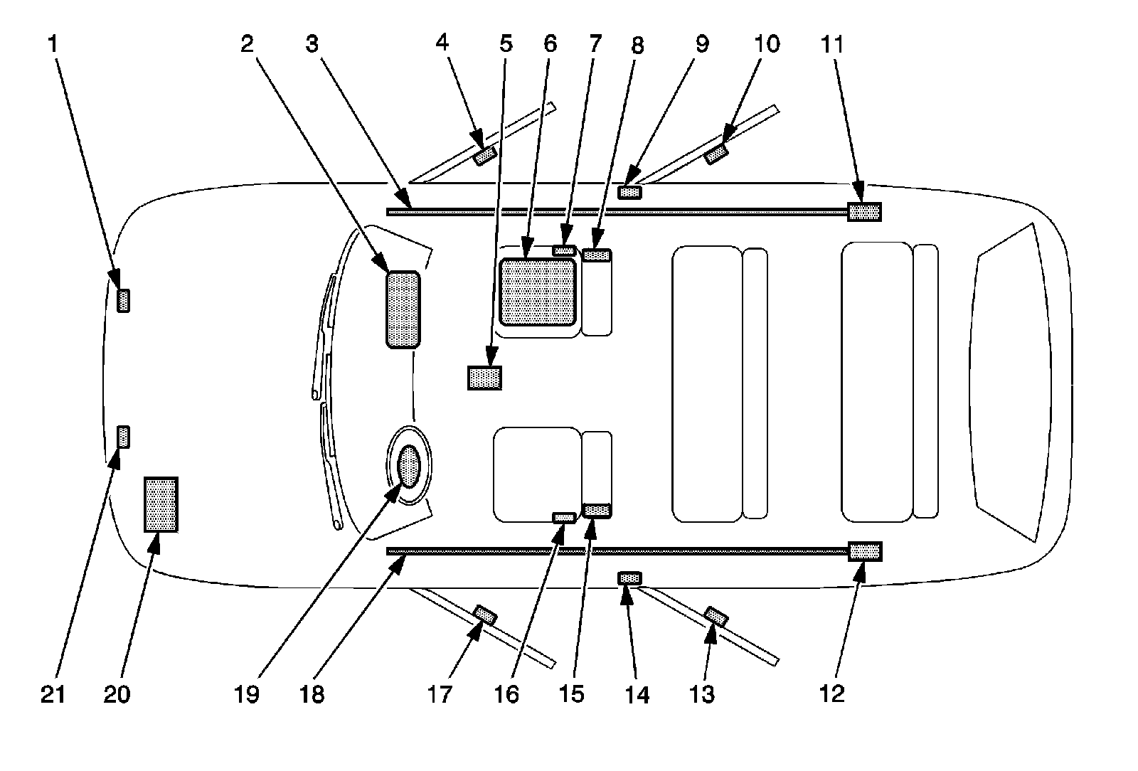 3 - Right Roof Rail Air Bag -Located under the headliner, extending from the passenger front windshield pillar to the passenger rear windshield pillar
