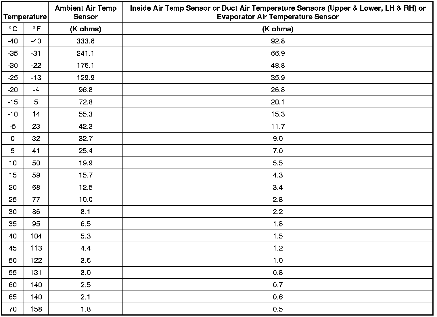 Sensor Resistance Table
