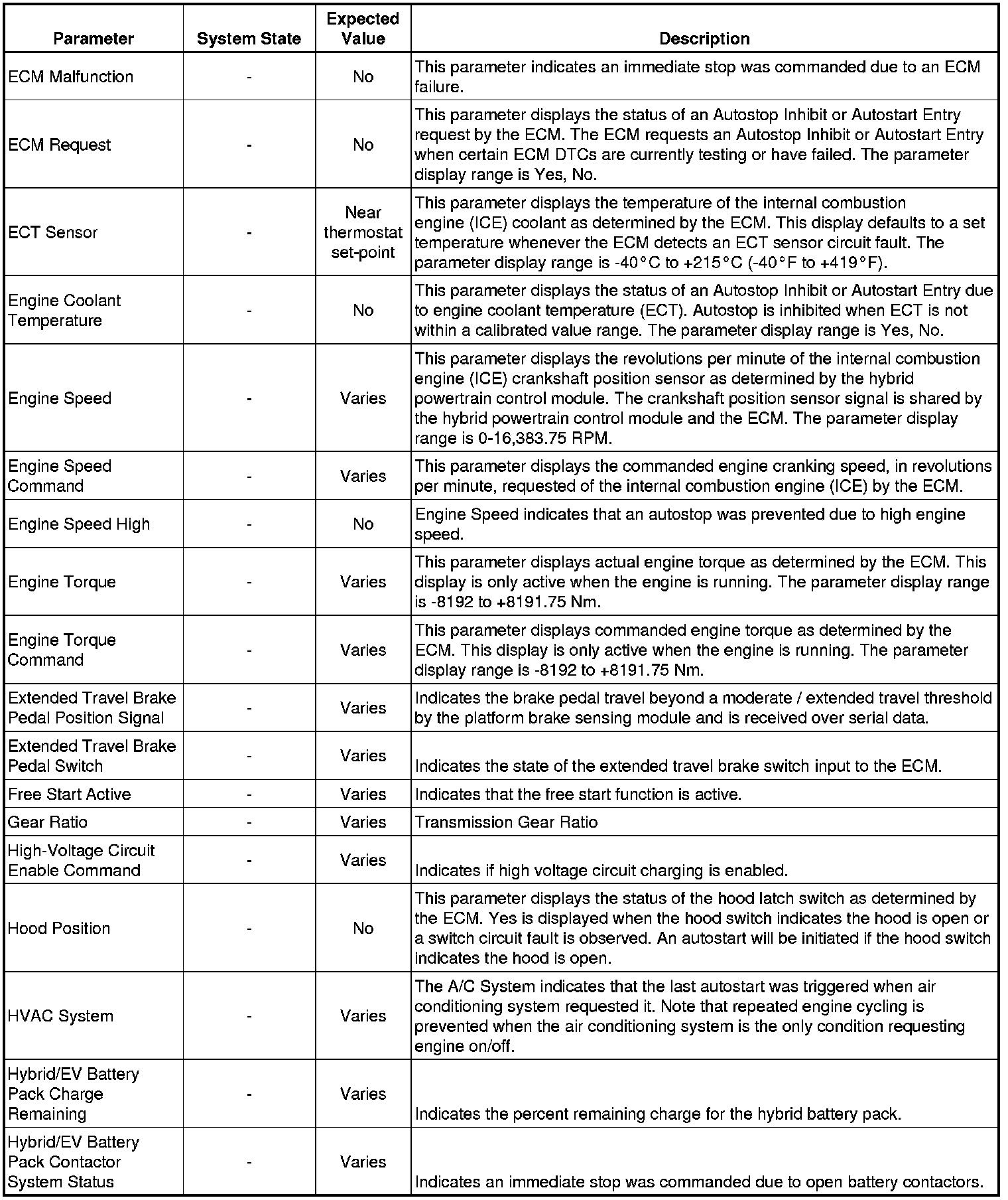 Only the parameters listed below are referenced in this service manual for use in diagnosis. If all values are within the typical range described below, refer to Symptoms - Hybrid Controls Symptoms - Hybrid Controls for diagnosis.