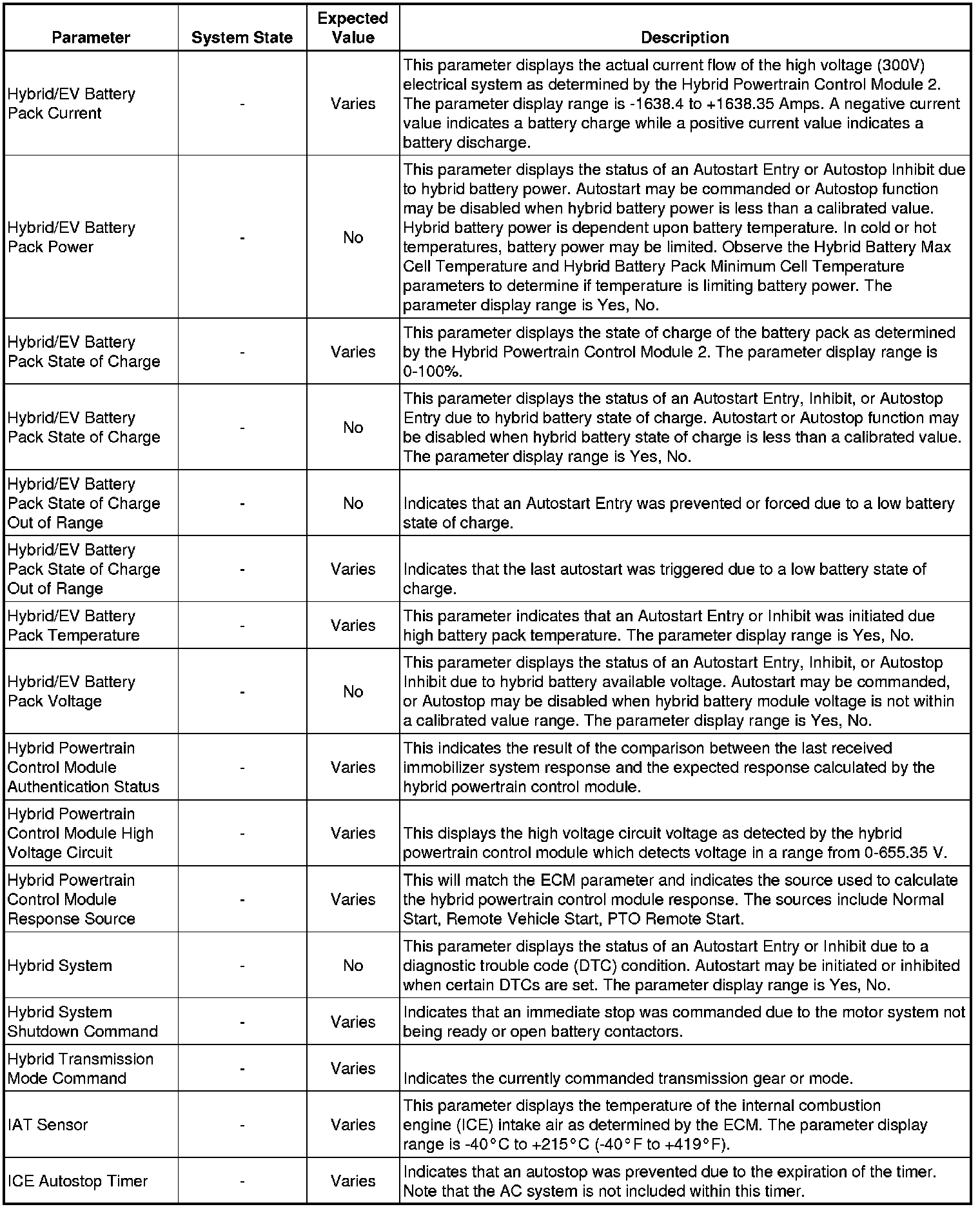 The scan tool values from a properly running vehicle may be used for comparison with the vehicle you are diagnosing. The Hybrid Powertrain Control Module Scan Tool Data Parameters list represents values that would be seen on a normally running vehicle.