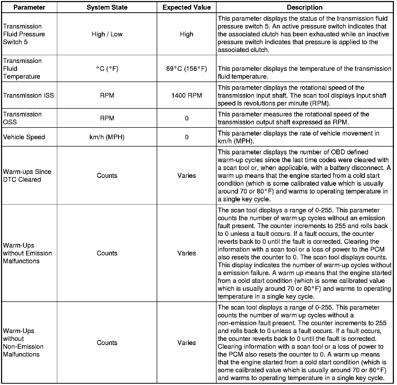 The scan tool values from a properly functioning transmission may be used for comparison with the transmission you are diagnosing. The values below represent a typical display recorded from a properly functioning system.