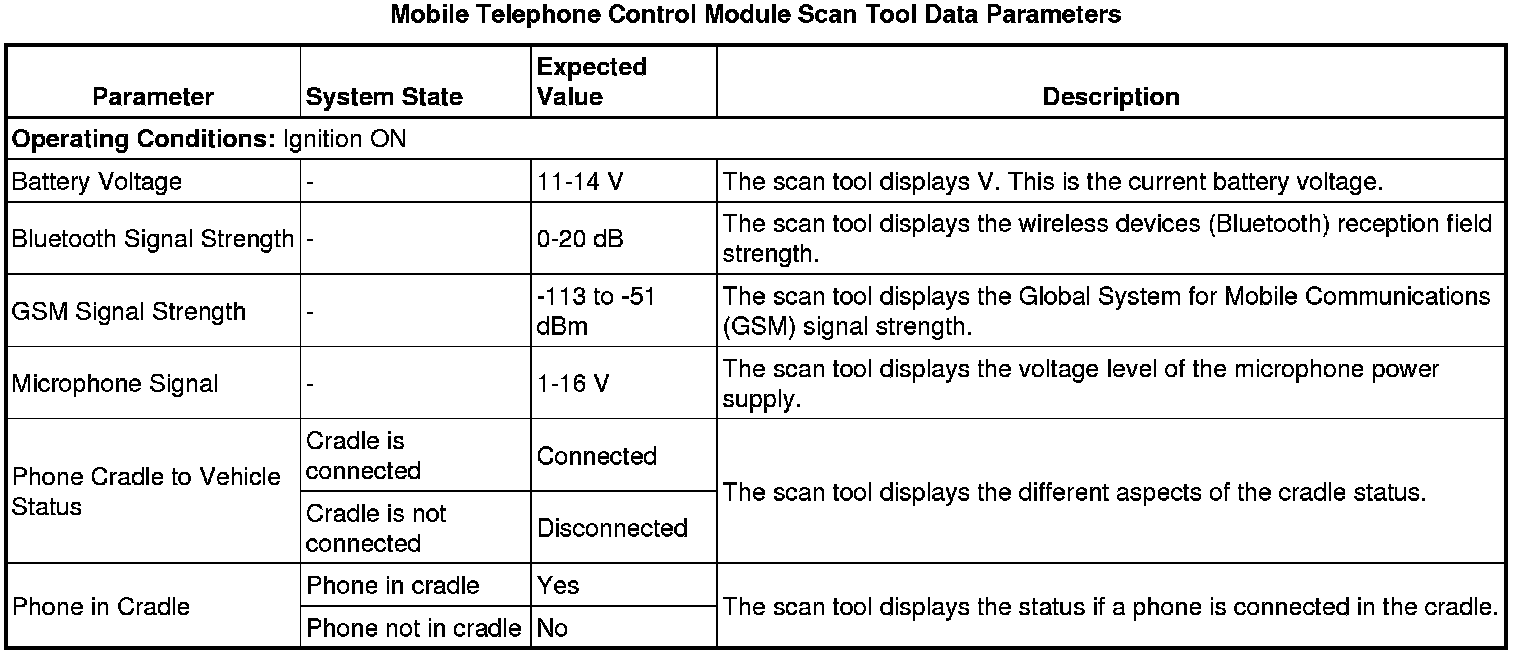 The mobile telephone control module scan tool data parameters list contains all mobile telephone control module related parameters that are available on the scan tool. The list is arranged in alphabetical order. A given parameter may appear in any one of the data lists.