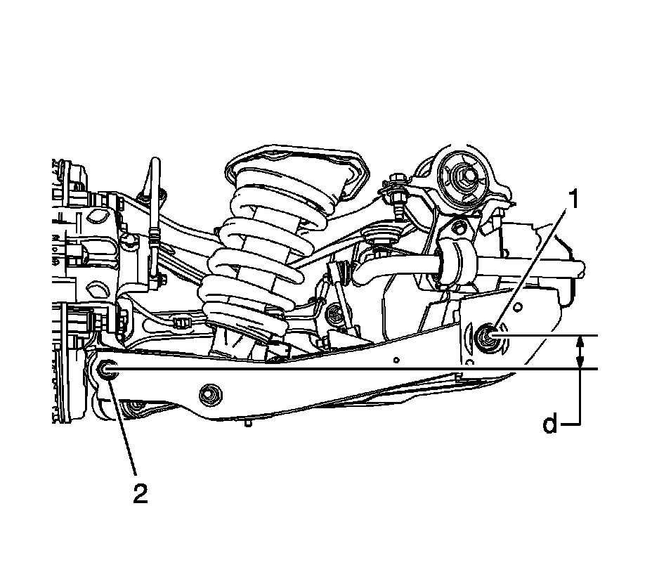 The D Height: The vertical distance from the center of the lower control arm inner bushing bolt head (1) to the center of the lower control arm outer bushing bolt head (2).
