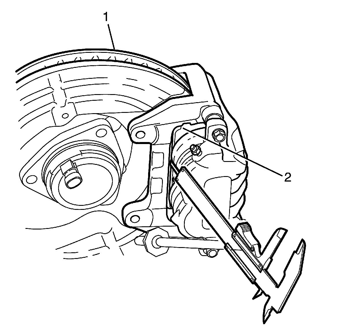 Using a vernier caliper measure and record the distance from the friction surface of the brake rotor (1) to the outer edge of the inner brake pad backing plate (2).