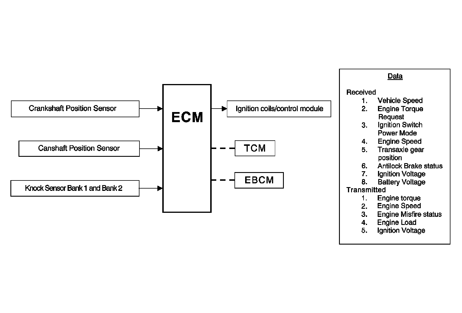 The electronic ignition (EI) system produces and controls the high energy secondary spark. This spark ignites the compressed air/fuel mixture at precisely the correct time, providing optimal performance, fuel economy, and control of exhaust emissions. The engine control module (ECM) primarily collects information from the crankshaft position (CKP) and camshaft position (CMP) sensors to control the sequence, dwell, and timing of the spark.