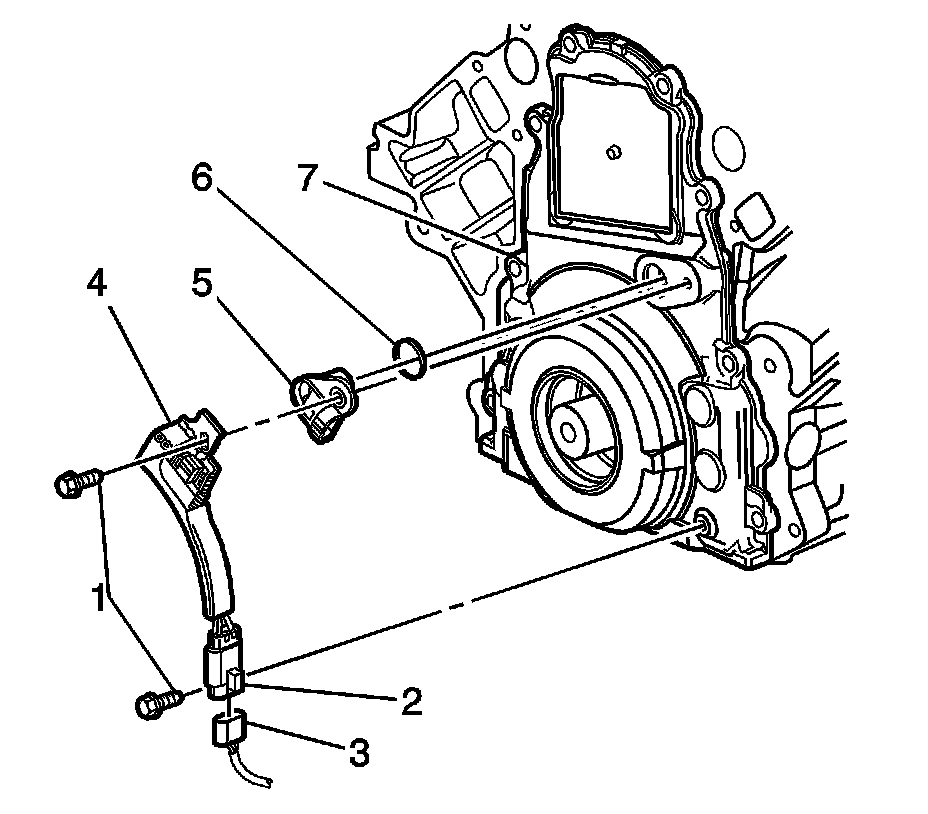 3. Remove the camshaft position sensor assembly (4, 5, 6) from the front cover (7).