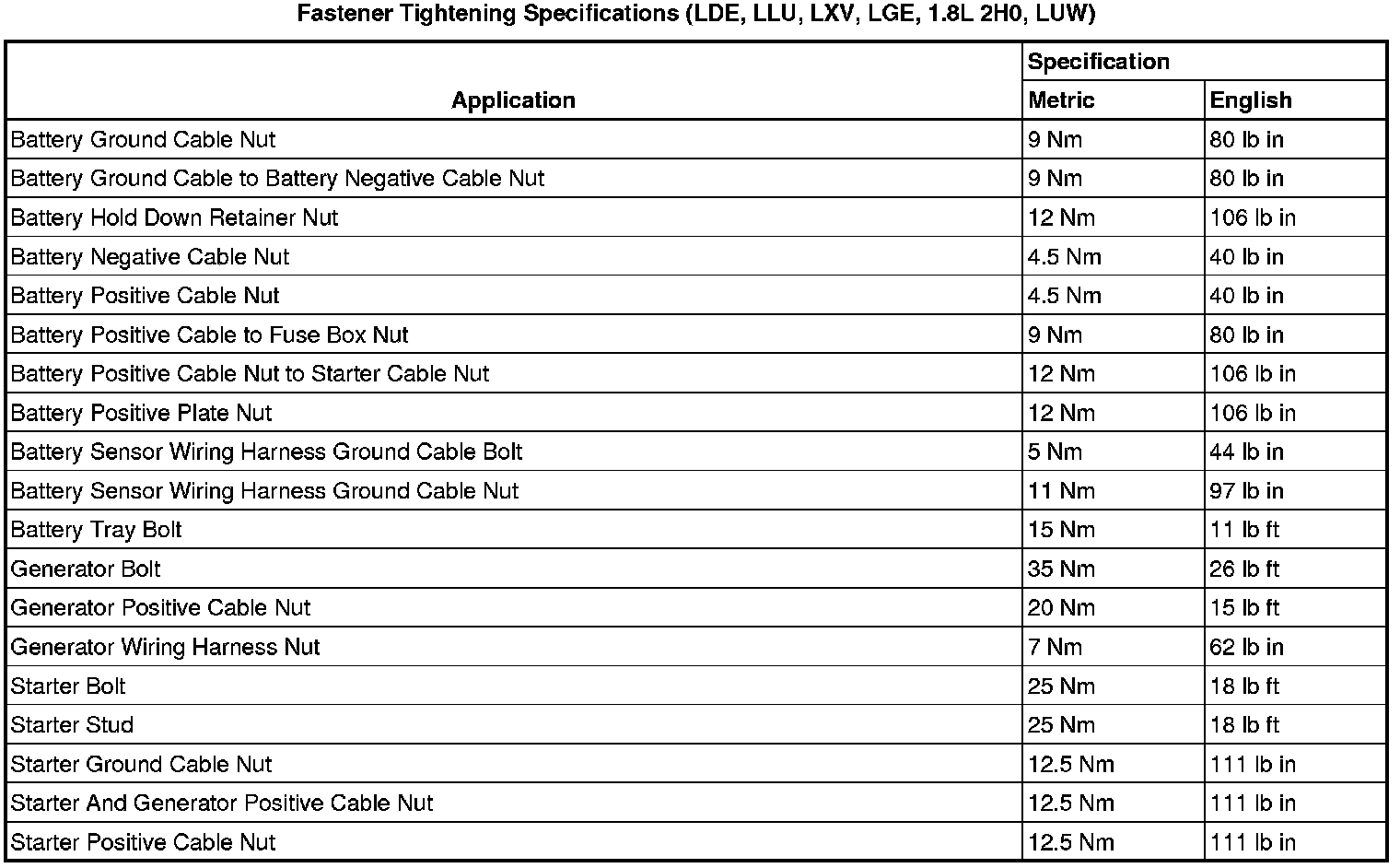 Fastener Tightening Specifications (LDE, LLU, LXV, 2H0, LUW and LFH)