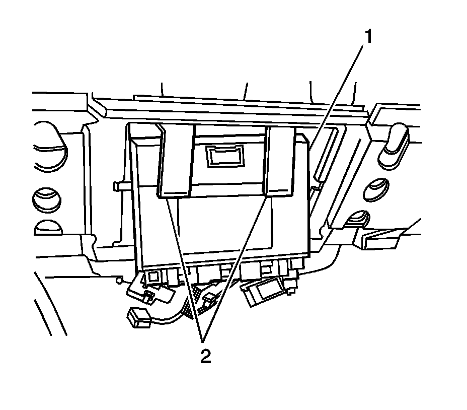 3. Release the tabs (2) retaining the BCM (1) to the bracket.