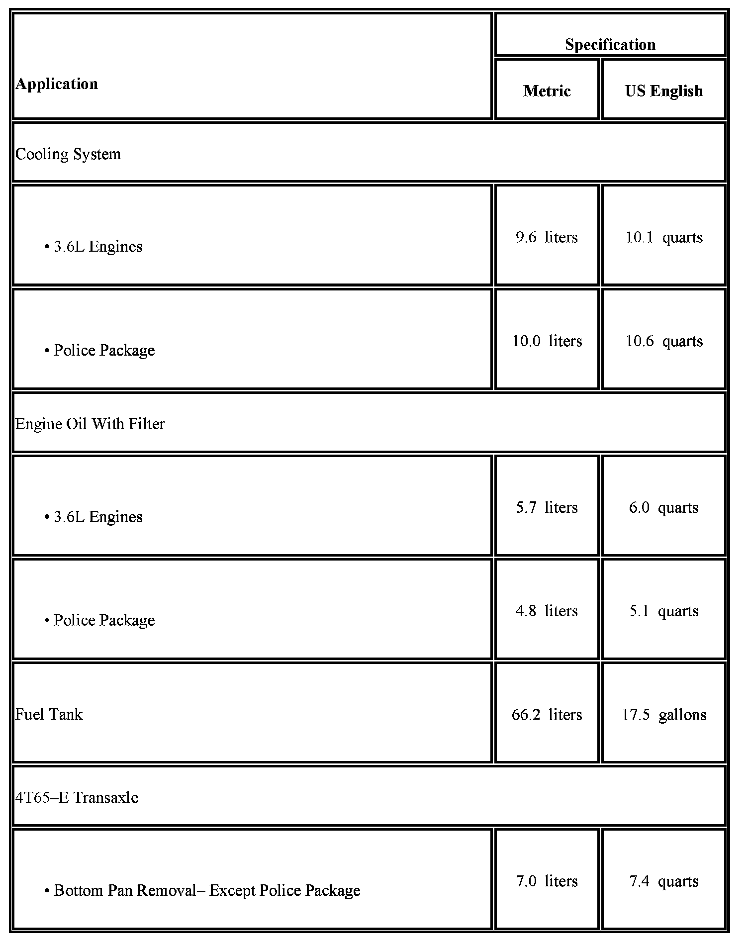 The following approximate capacities are given in US English and metric conversions. See Fluid and Lubricant Recommendations (Maintenance) for more information. All capacities are approximate. When adding, be sure to fill to the approximate level, as recommended in this manual. Recheck fluid level after filling.